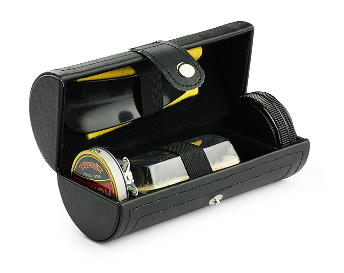 Vielseitiges Schuhputzset aus lederähnlichem Material (PU). Enthält klare Politur, Reiniger, Schuhlöffel, Tuch und Bürste. Wir bringen Ihr Logo auf der Tube an.