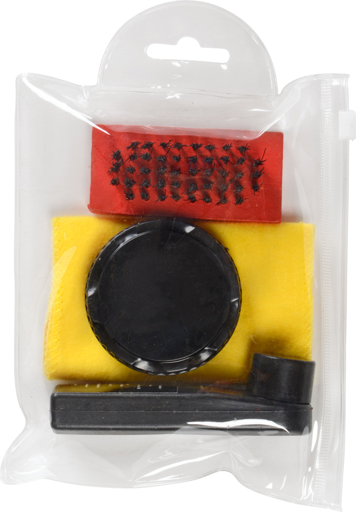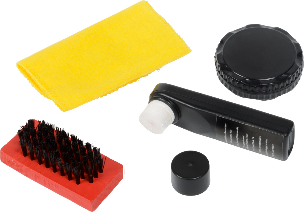 Schuhputzset SMALL SHINE: bestehend aus Holzbürste, Poliertuch (ca. 23 x 10 cm), farbloses Schuhöl mit Schwammapplikator, Schwamm mit farblosem Silikonöl, in transparenter Tasche mit Zipper