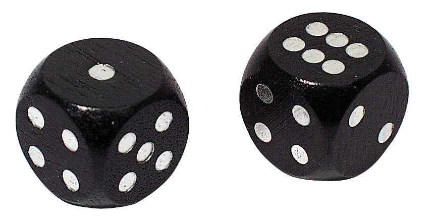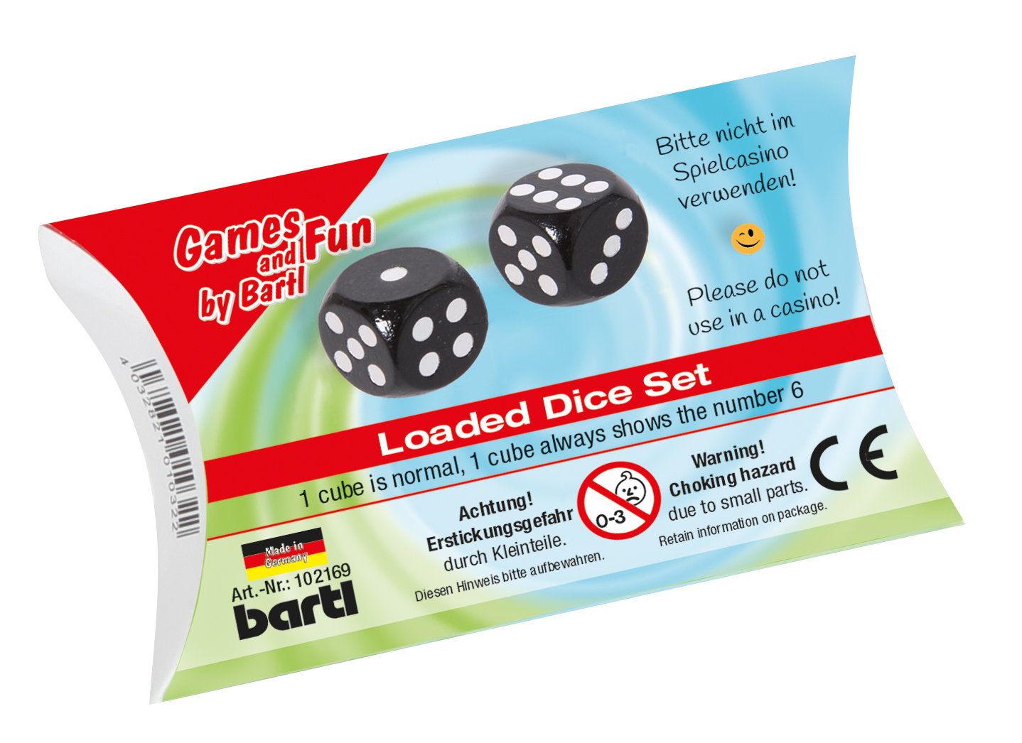 Einer der Würfel ist präpariert und fällt immer auf die Sechs - Anwendung auf eigene Gefahr! Würfelgröße: 1,8 x 1,8 x 1,8 cm.