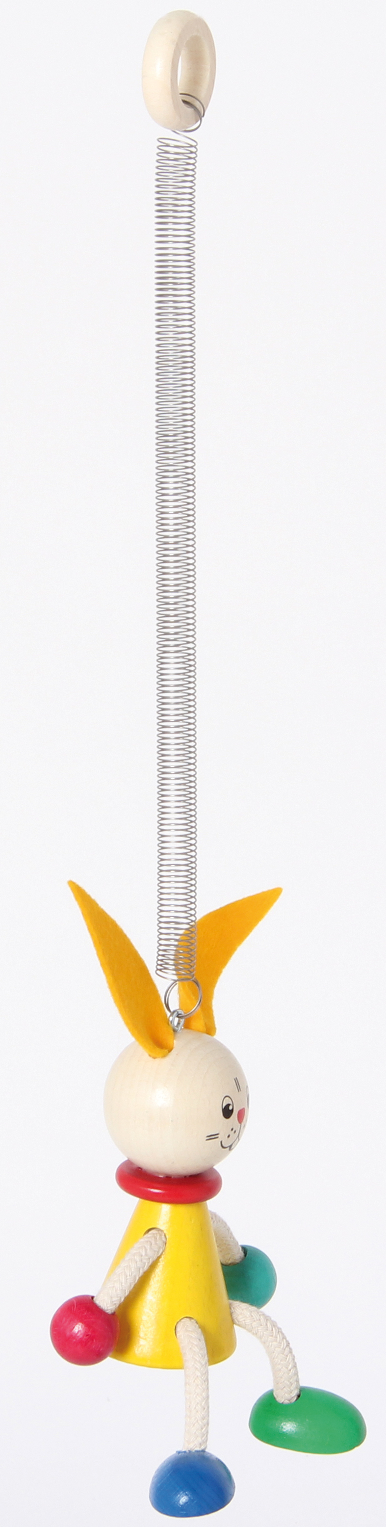Holzfigur mit beweglichen Armen und Beinen. Ihre Feder hat einen Holzring zum Aufhängen.