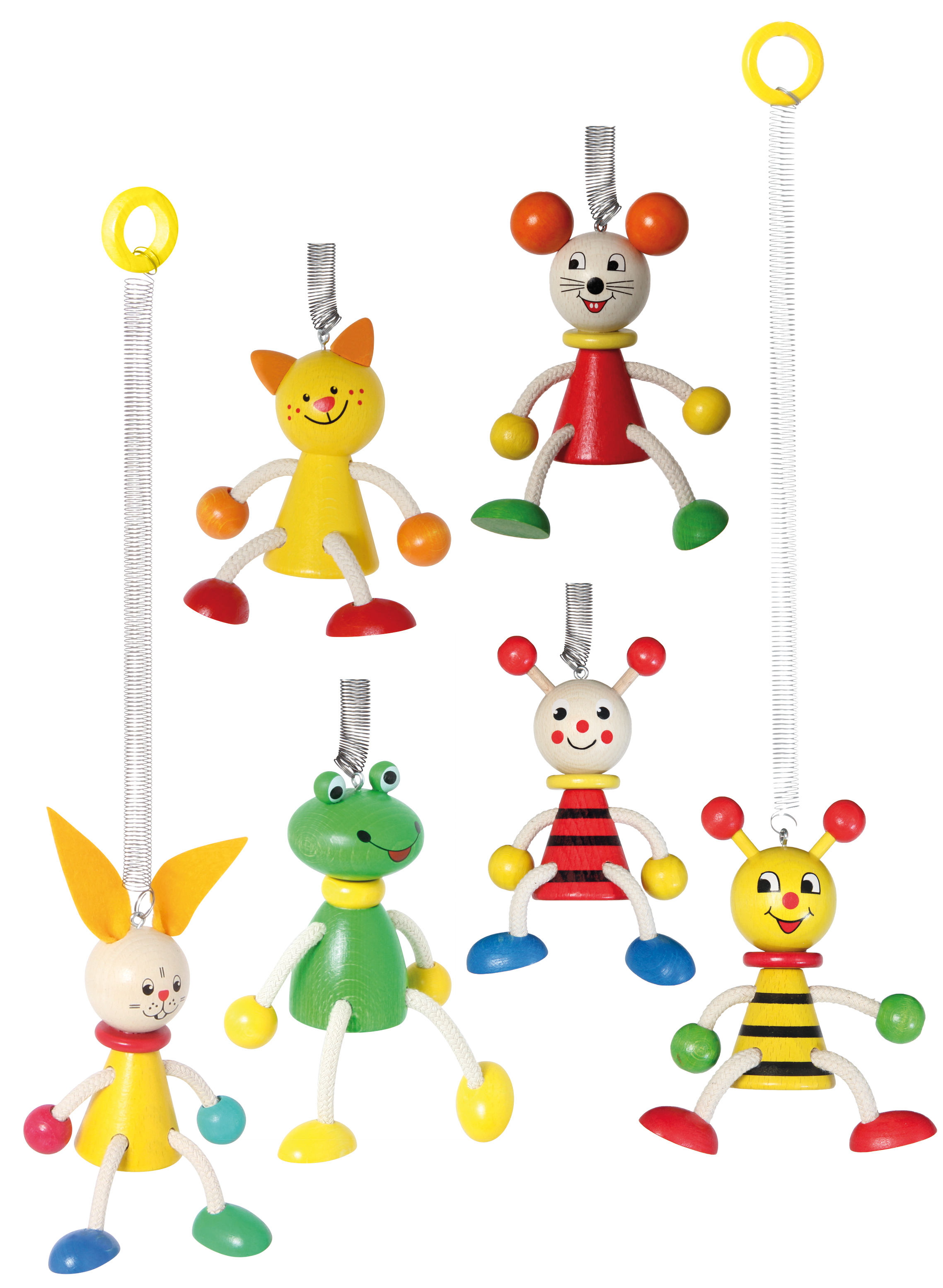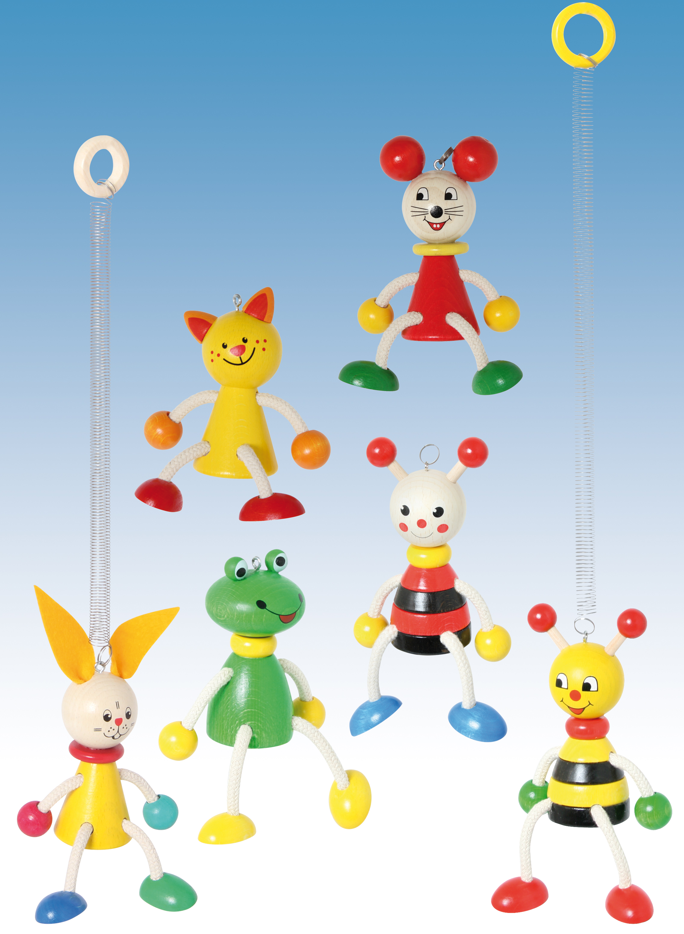 Aus Holz. Mit beweglichen Armen und Beinen. Die Feder hat einen Holzring zum Aufhängen. Biene, Käfer, Maus, Frosch, Katze, Hase im Set (siehe Art.-Nr. 103473, 103474, 103475, 103476, 103477, 103480!).