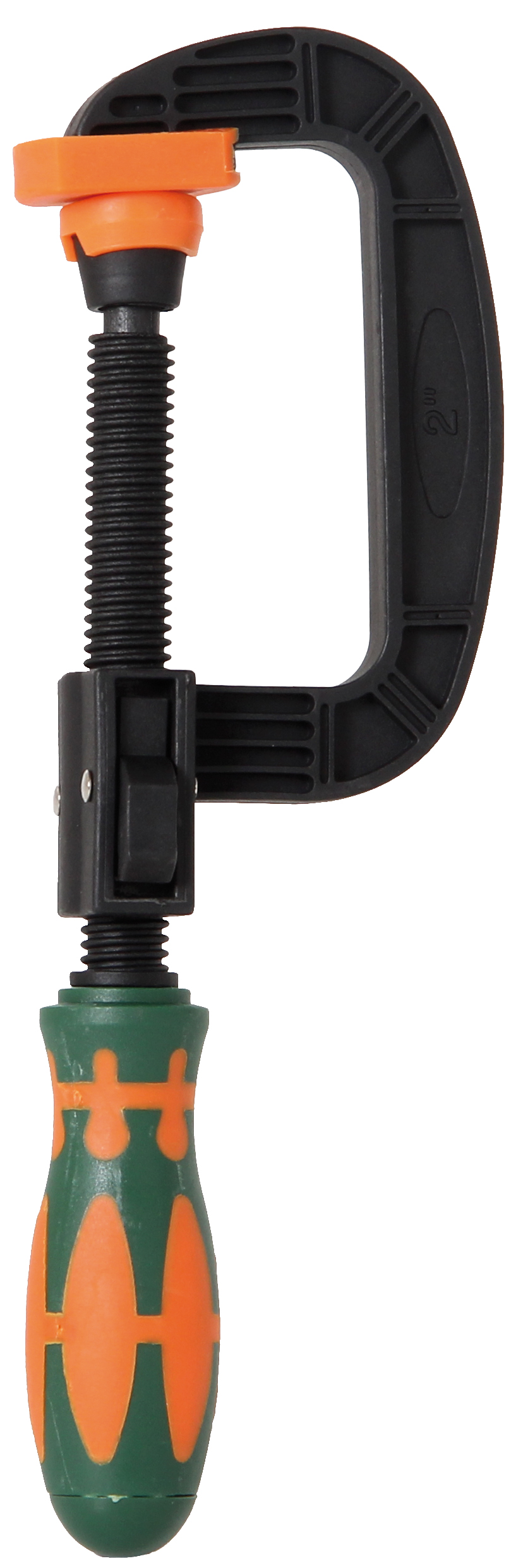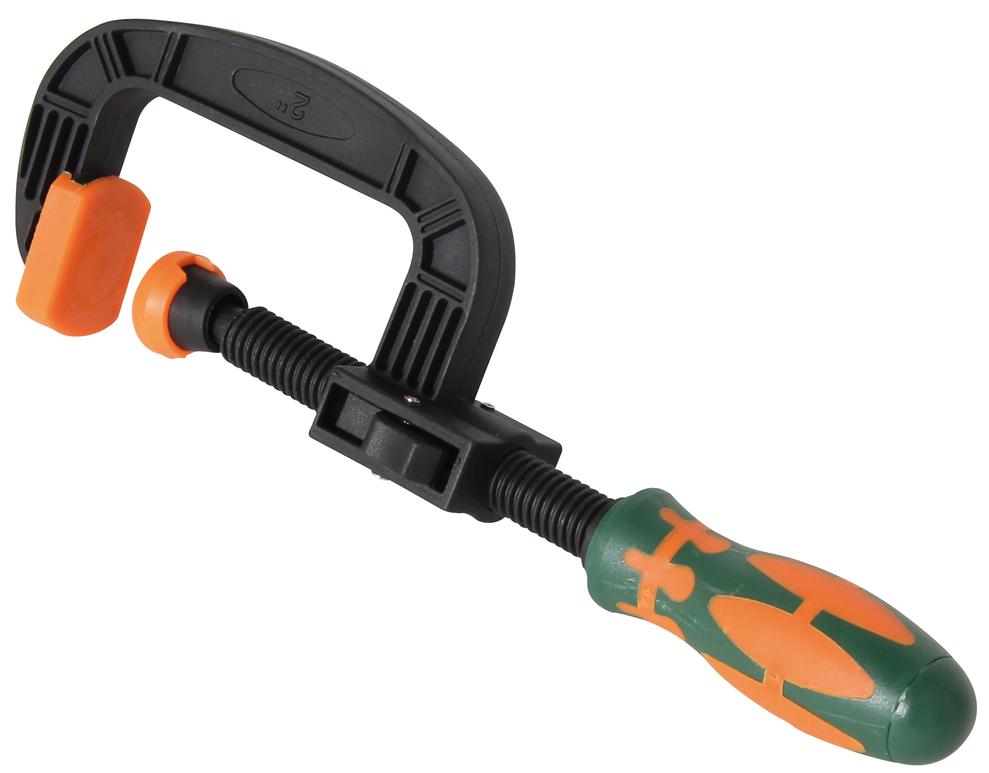 Handliche Schraubzwinge mit Kunststoffgriff, 90° abwinkelbar und Nylonhalterung zur Befestigung am Gürtel.