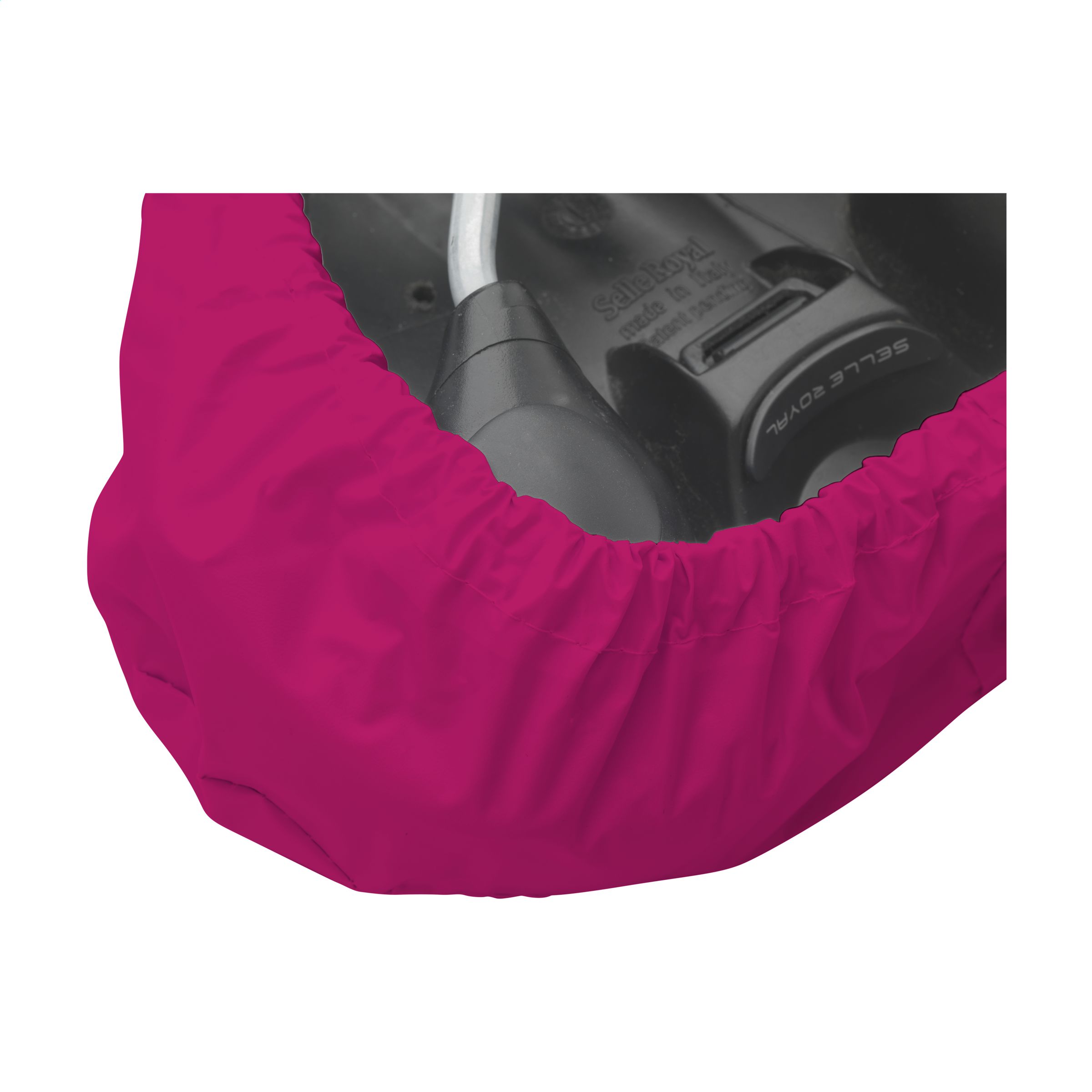 WoW! Sattelüberzug aus recyceltem PVC (60% recyceltes PVC und 40% reines PVC). Jeder Sattelüberzug ist innen mit einer Pappfolie versehen, damit er nicht knittert. Das Gummiband unten ist bei diesem Modell nicht sichtbar, es ist sauber verarbeitet. Der Bezug schützt den Sattel vor Schmutz und Feuchtigkeit (nicht 100% wasserdicht).
