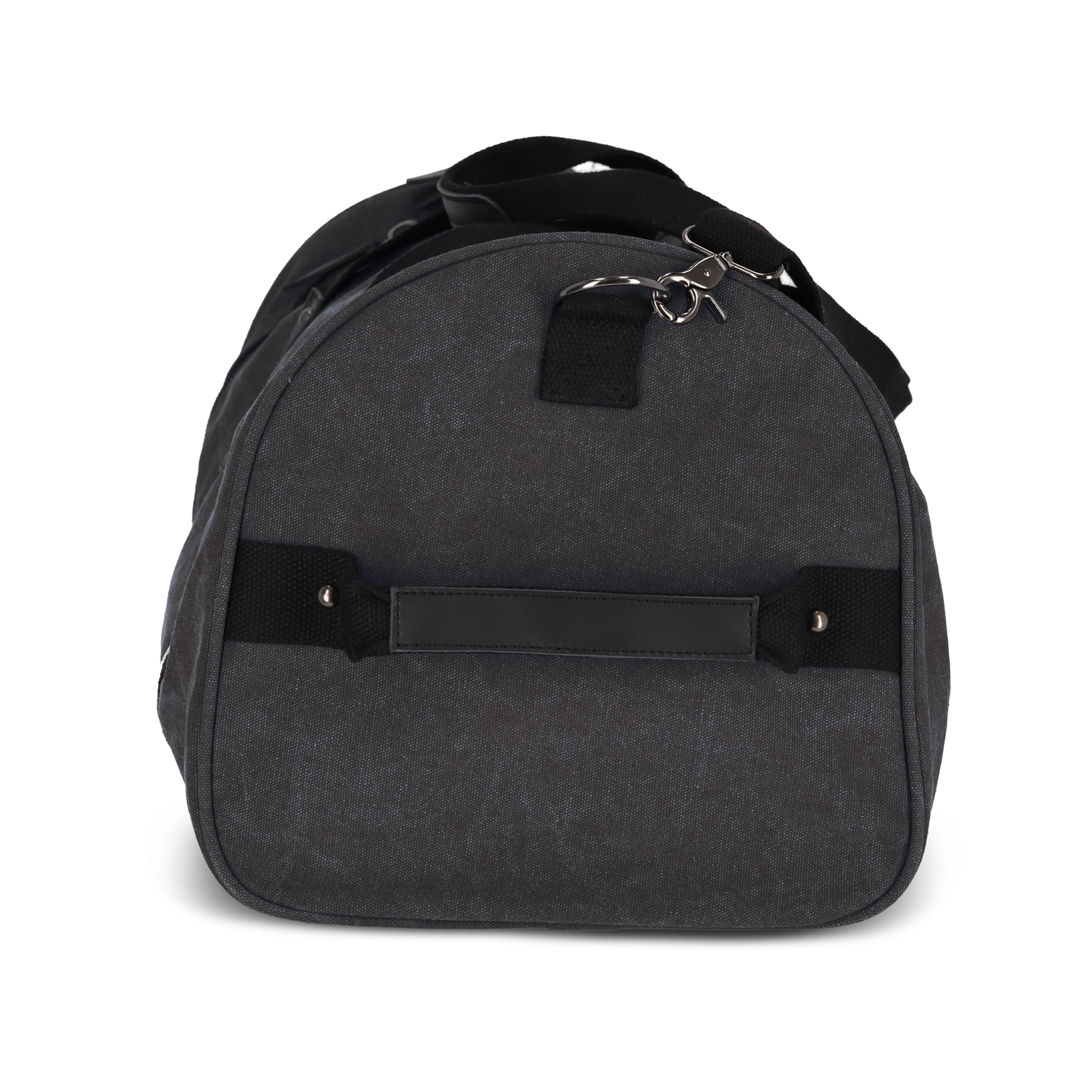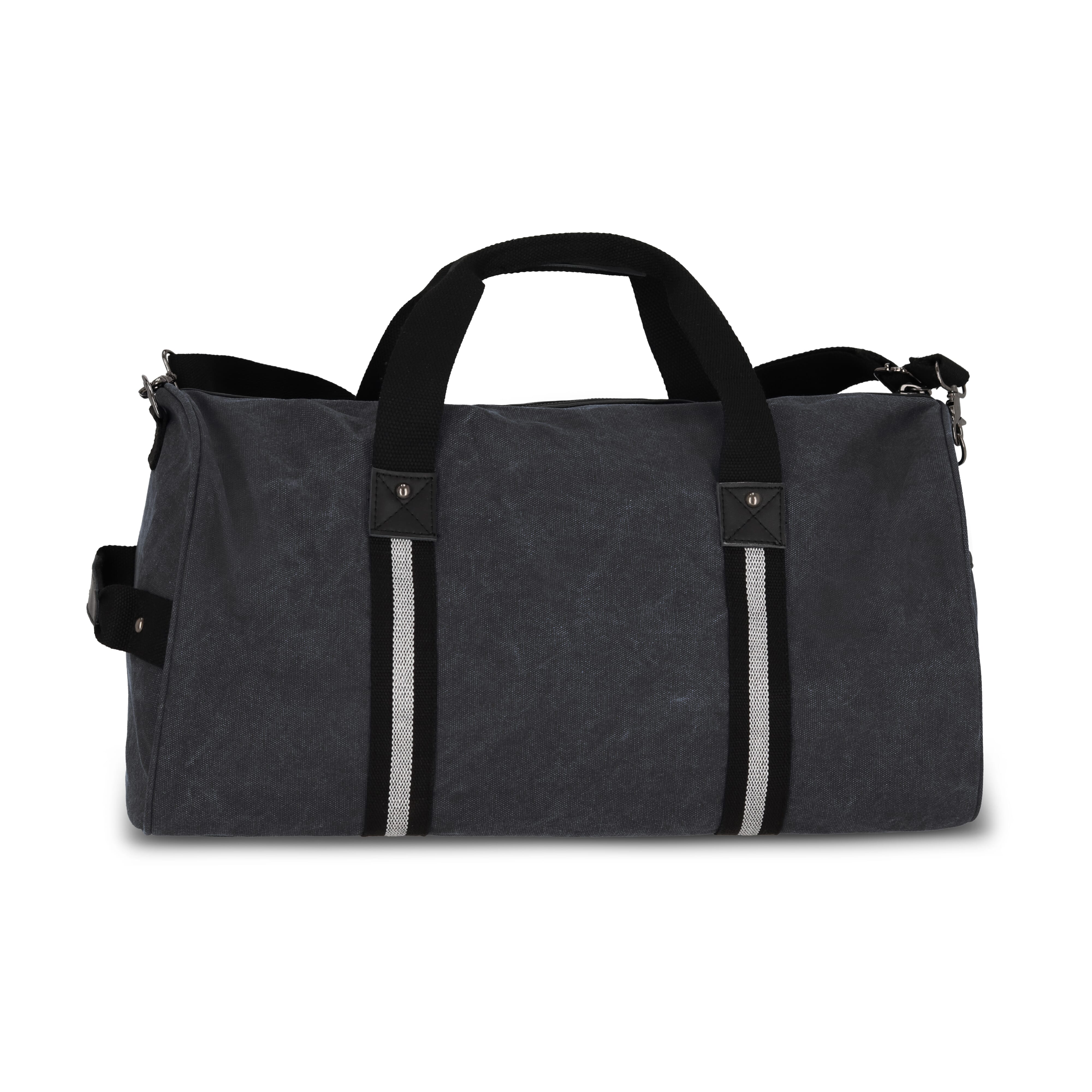 Elegante Reisetasche aus recyceltem Baumwoll-Canvas. Mit 100% recyceltem, reflektierendem Gurtband, luxuriösen Reißverschlüssen und Griffen sowie einem Futter aus 100% recyceltem Polyester. Mit seitlichen Tragegriffen, verstellbarem, abnehmbarem Schultergurt, 1 Seitentasche, 2 Vordertaschen und 3 Innentaschen, eine davon mit Reißverschluss.