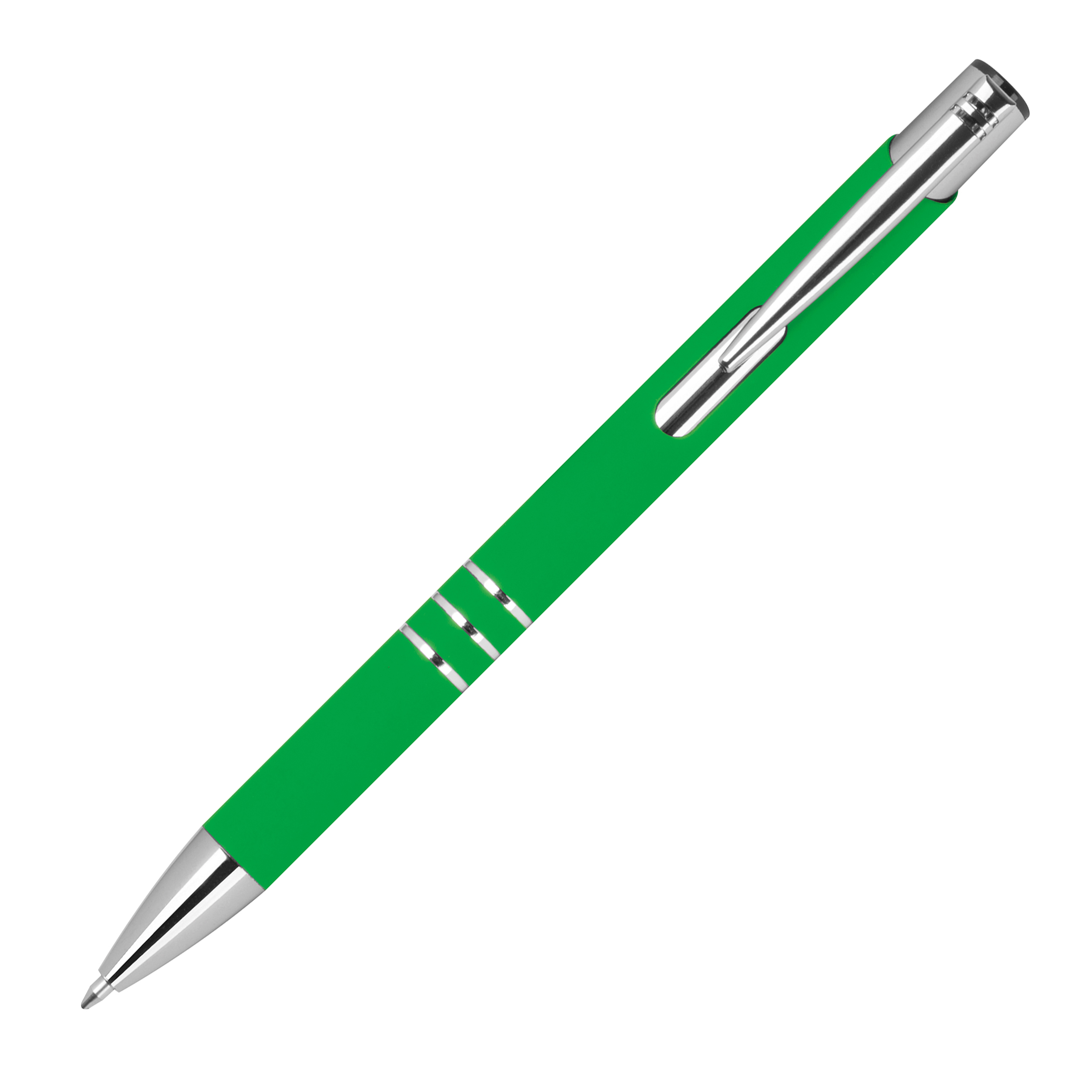 Schreibgerät mit Semi Gel Mine aus recyceltem Aluminium mit gummierter Oberfläche und blau schreibender Gelmine. Ihre Werbung gravieren wir neben den Clip.