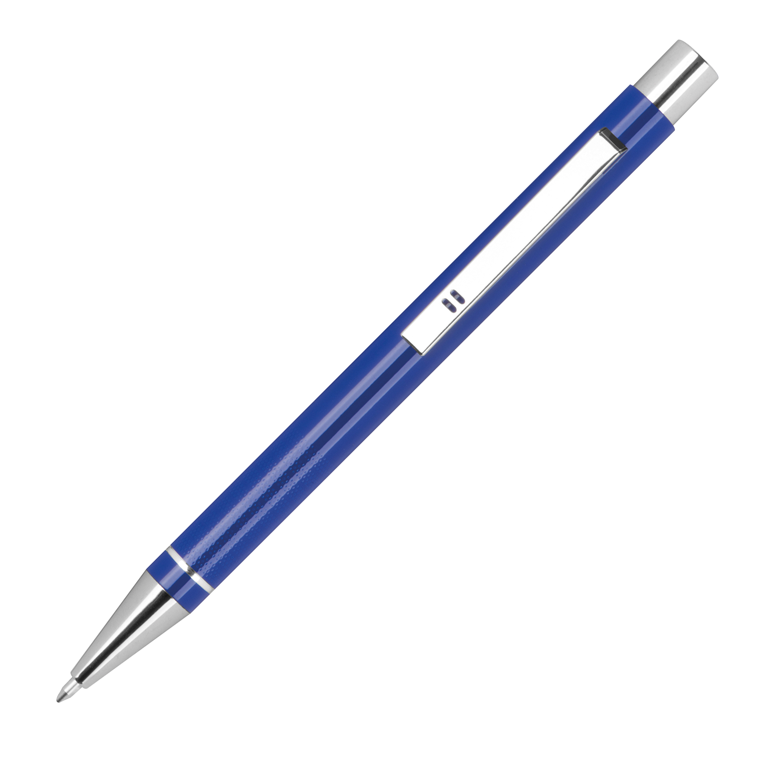 Metall Schreibgerät mit blauschreibender Semi Gelmine (1 mm Tip) und geriffelter Griffzone. Ihre Werbung lasern wir rechts vom Clip.