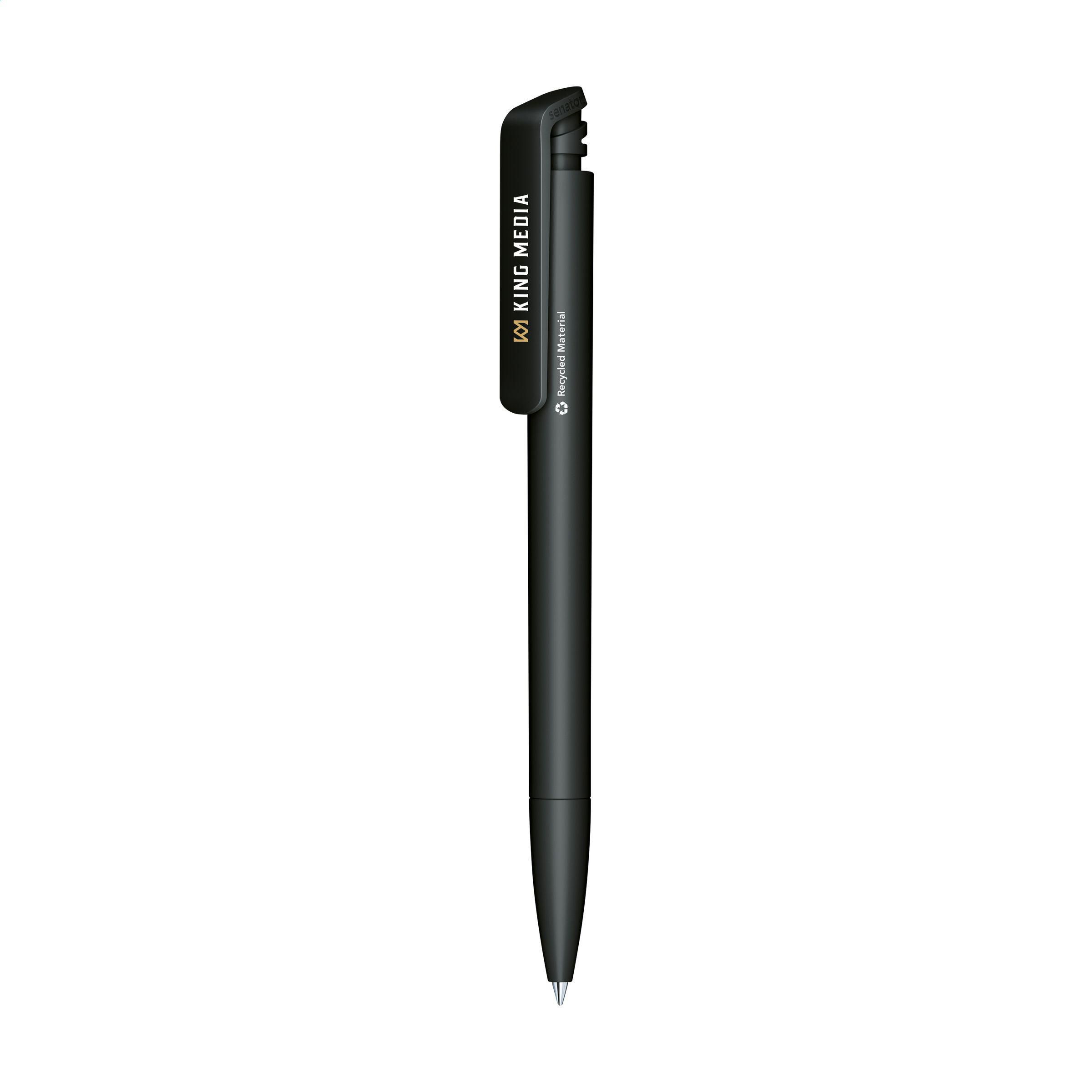Beschreibung: Blauschreibender Kugelschreiber der Marke Senator®. Hergestellt aus recyceltem Material. Dieser Kugelschreiber hat eine glatte, matte Oberfläche und einen großzügig bemessenen Clip/Druckknopf. Das Gehäuse ist neben dem Clip mit dem kleinen Symbol für „aus recyceltem Material“ bedruckt. Aufgrund des verwendeten Recyclingmaterials kann es zu leichten Unregelmäßigkeiten in der Oberfläche des Kugelschreibers kommen. Made in Germany.