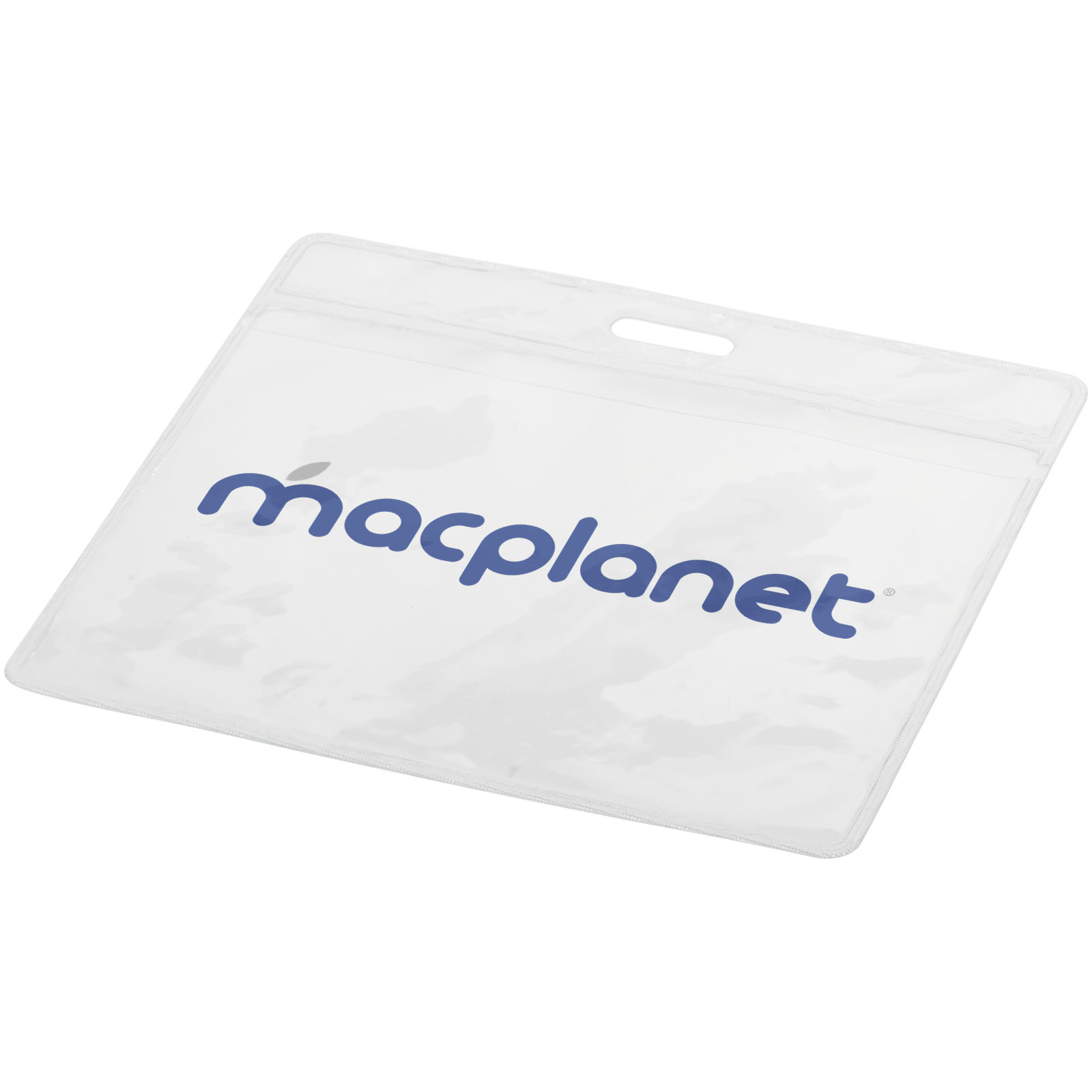Ausweishülle mit Einschubfach hinten und Öffnung oben, um die Hülle an einem Lanyard oder Rollerclip zu befestigen. Maße: 8,8 x 10 cm für Karten bis 9,4 x 6,7 cm.