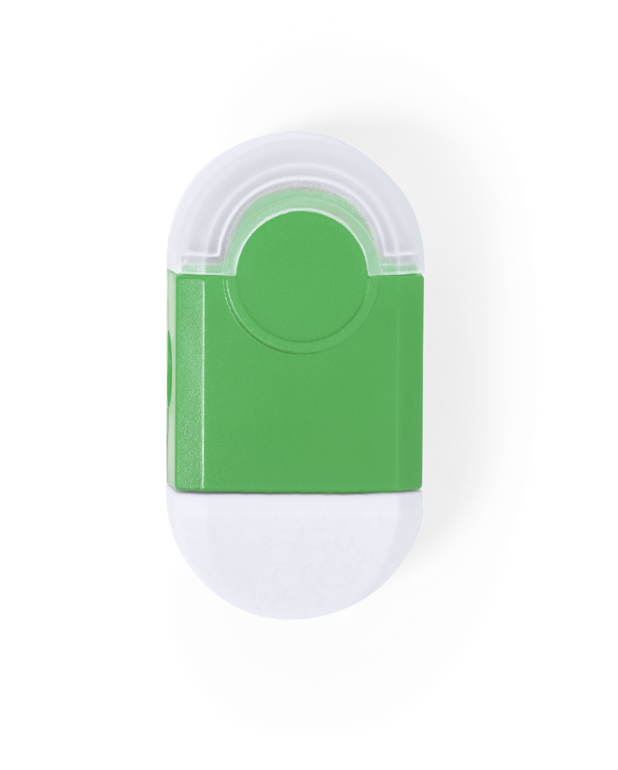 Set aus Radiergummi und Anspitzer in lebendigen Farben. Auffangbehälter mit transparentem Deckel.