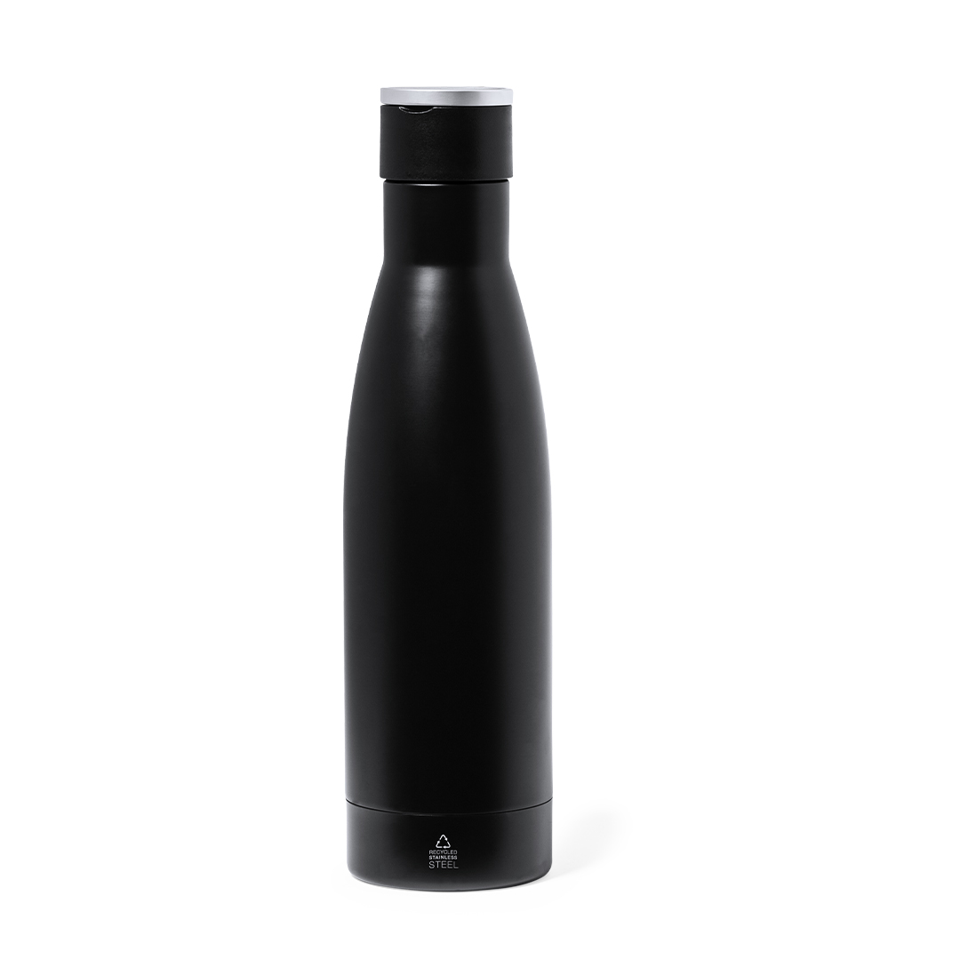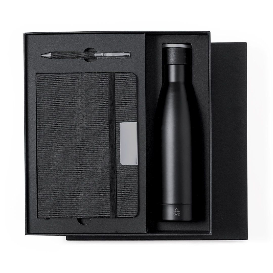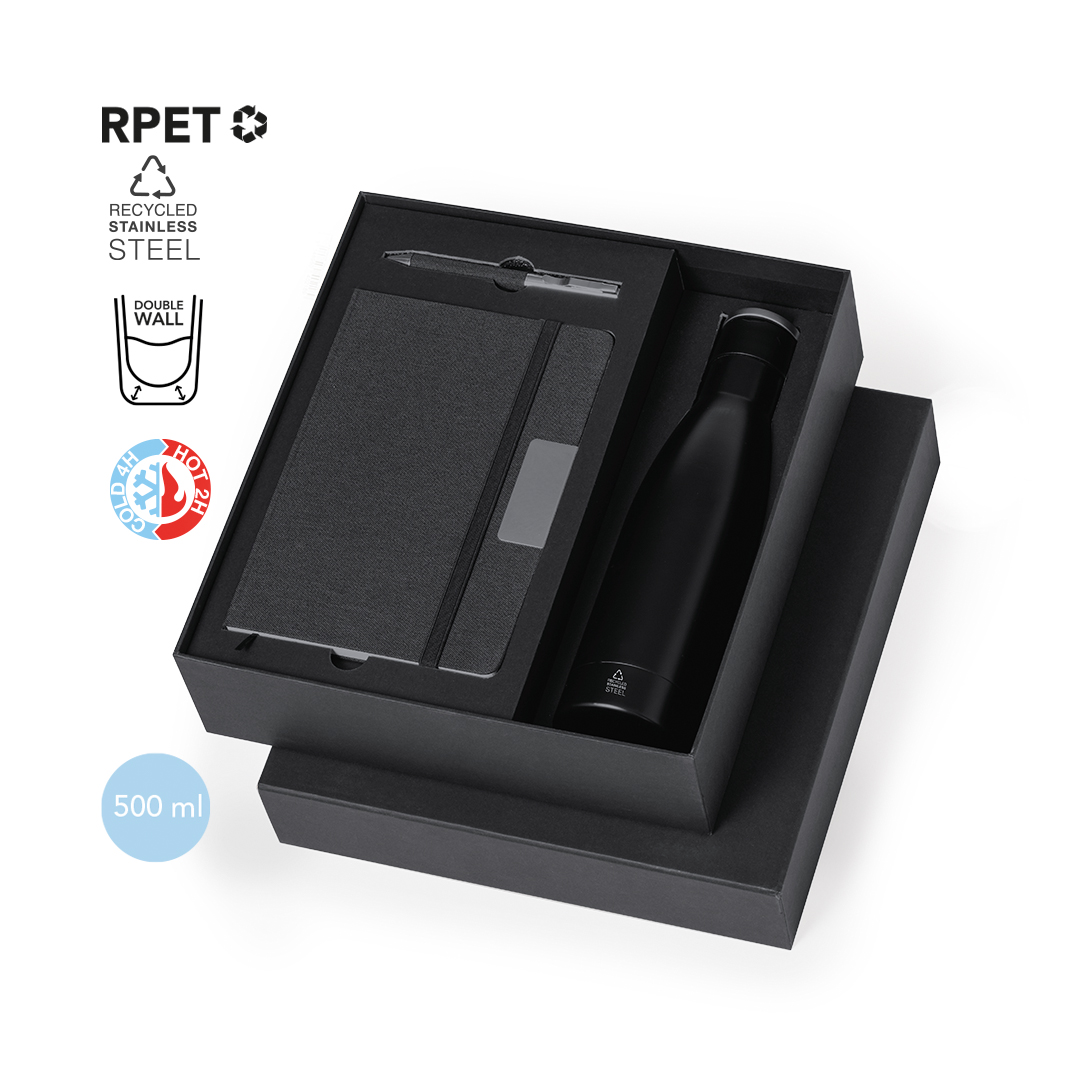 Elegantes Premium-Set, bestehend aus:Doppelwandige Thermoskanne aus recyceltem Edelstahl mit mattschwarzer Oberfläche und 500 ml Fassungsvermögen, mit stabilem, matt-silbernem Metallgriff. Mit Embleem für rostfreiem Stahl. RPET-Notizblock in elegantem Schwarz mit speziellen Metalldetails für die Laserbeschriftung. Mit elastischem Verschluss und Lesezeichen aus Stoff. Innen mit 80 linierten Blättern. Mit RPET-Logo. RPET-Kugelschreiber mit mattschwarzem Finish, Drehmechanismus und blauer Tinte. Mit Clip und Spitze aus poliertem Metall. Das Set wird in einem individuellen matten Etui präsentiert, mit einer Innenstanzung für jedes Element des Sets. Das RPET-Material wird aus recyceltem Kunststoff hergestellt, um die Wiederverwendung von Kunststoffabfällen zu fördern und die Nachhaltigkeit unseres Planeten zu unterstützen.