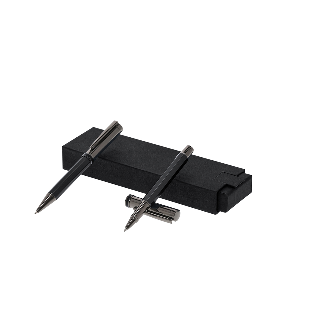 Exklusives Kugelschreiber- und Rollerball-Set von höchster Qualität aus der Limited Edition Kollektion. Ein modernes, funktionales und wunderschönes Accessoire, das alle Erwartungen übertrifft. Ausgezeichnet durch sein elegantes, minimalistisches Design. Hergestellt aus starkem, langlebigem Edelstahl, in perfekter Kombination mit Aluminium. Kugelschreiber mit raffiniertem Drehöffnungssystem und Rollerball mit praktischem Verschluss. Hexagonales Griffdesign in matten Metallic-Farben und einem schlichten, anthrazitglänzenden Oberteil. Mit Metallclip, blauer Tinte und nachfüllbar (Rollerball mit Jumbo-Patrone).Aus der perfekten Kombination von Exklusivität und Design entsteht Limited Edition, eine spezielle Kollektion von Werbeideen in limitierter Auflage. Ein neues Konzept, inspiriert von der Fusion von Premium-Produkten mit den neuesten und innovativsten Trends und mit einer begrenzten Auswahl, die ein Geschenk in eine einzigartige und unvergessliche Erfahrung verwandelt. Exklusive Limited Edition Präsentationsbox, mit einem durch gewerbliche Schutzrechte geschützten Design. Inklusive Karte mit Beschreibung der Limited Edition auf recyceltem Karton.
