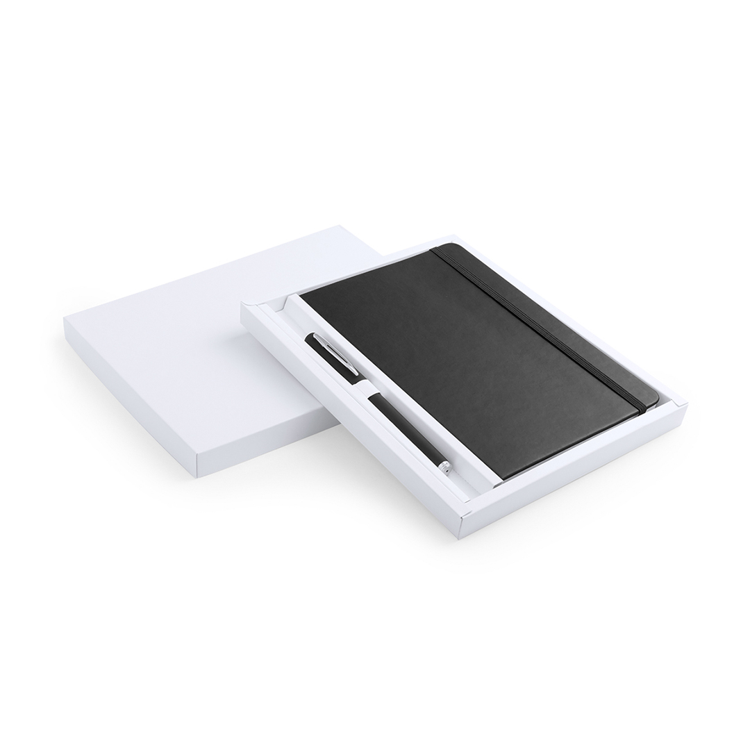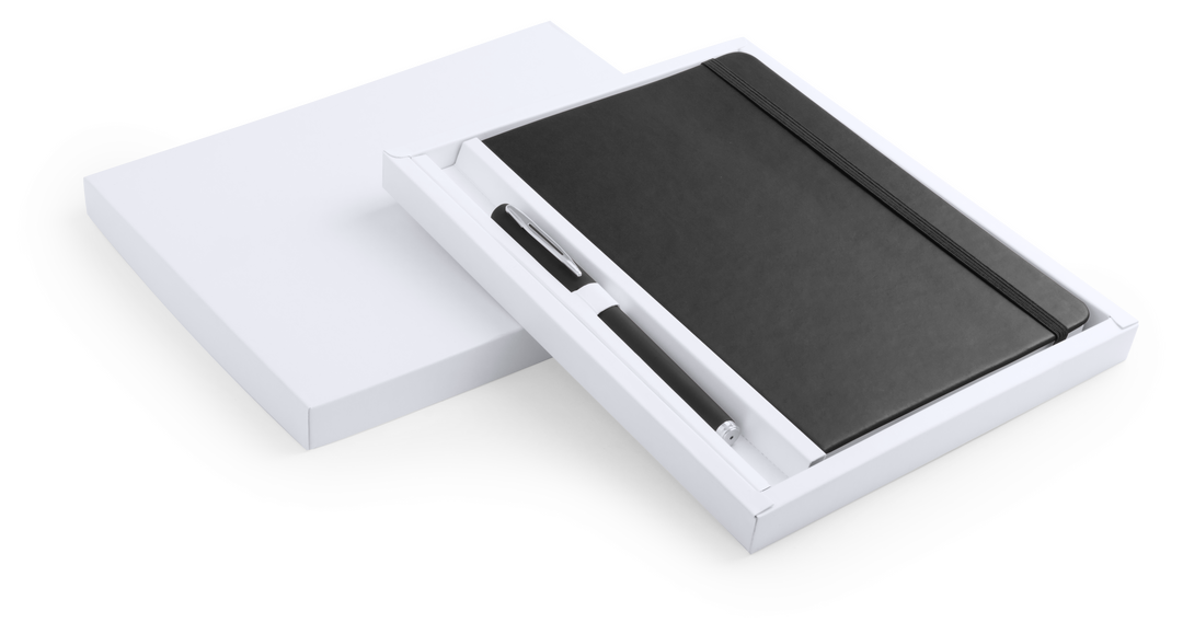 Set aus Notizblock mit Soft-Touch-Cover aus Kunstleder und Kugelschreiber. Mit 100 Blättern mit Gummiband zur Befestigung und farblich passendem Lesezeichenband. Präsentiert in einer eleganten Box aus weißem Karton mit Stanzung. Kugelschreiber mit blauer Tinte.