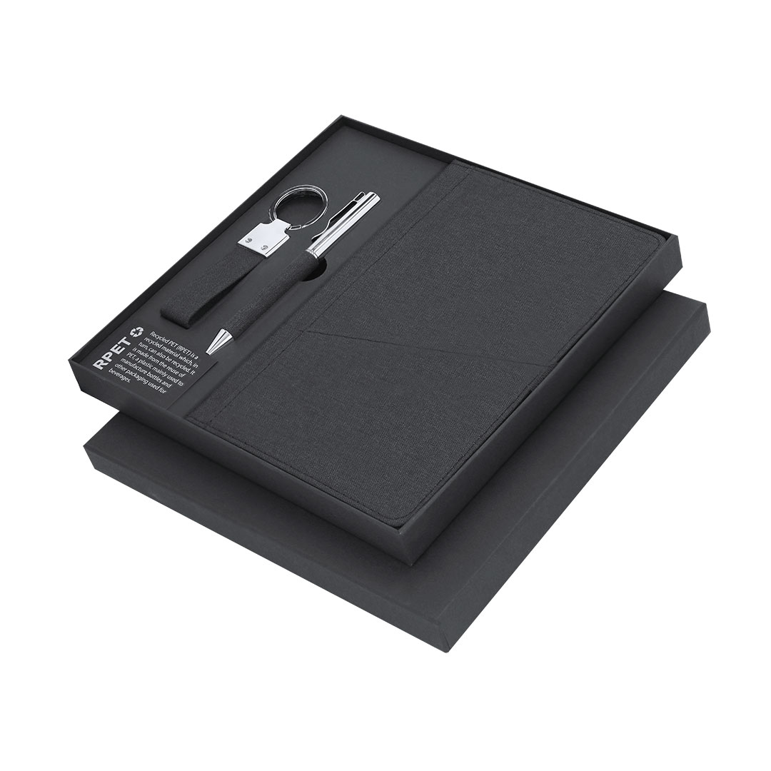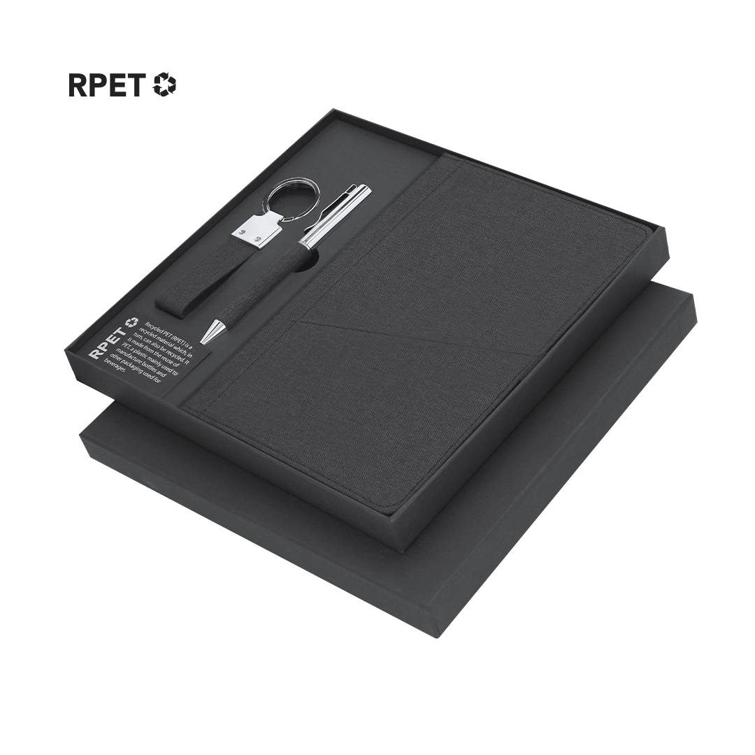 Elegantes Premium-Set, das enthält:Notizblock aus RPET in elegantem Schwarz. Einschließlich elastischem Verschluss, Fronttasche und Stoff-Lesezeichen. Innen mit 80 Blättern im linierten Format. Kugelschreiber aus RPET mit mattem Schwarz-Finish, mit Drehmechanismus und blauer Tinte. Mit Clip und polierter Metallspitze. Eleganter Schlüsselanhänger mit Band aus 300D RPET-Polyester und verchromten Zubehör. Set präsentiert in einer individuellen Schachtel mit Matt-Oberfläche, mit Innenschnitt für jedes Element des Sets und RPET-Karte im Inneren. Das RPET-Material wird aus recyceltem Plastik hergestellt, um die Wiederverwendung von Plastikabfällen zu fördern und zur Nachhaltigkeit des Planeten beizutragen.