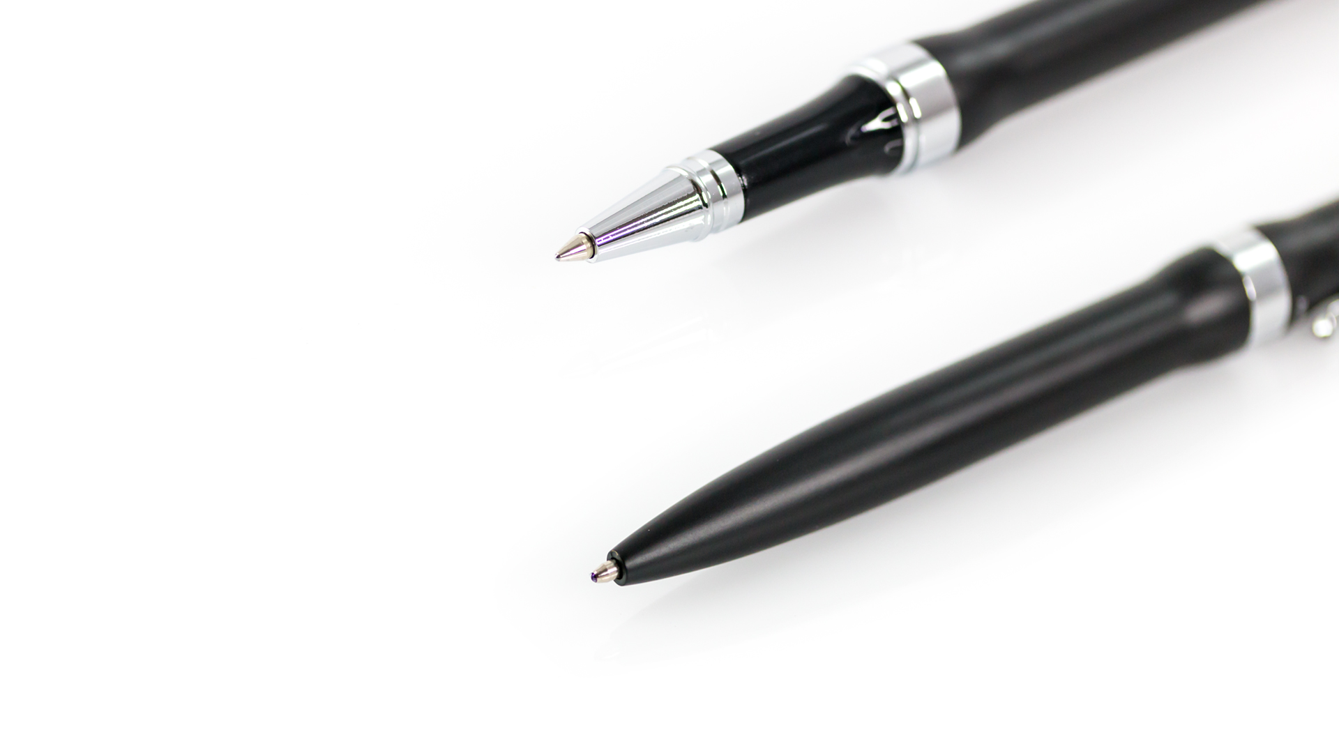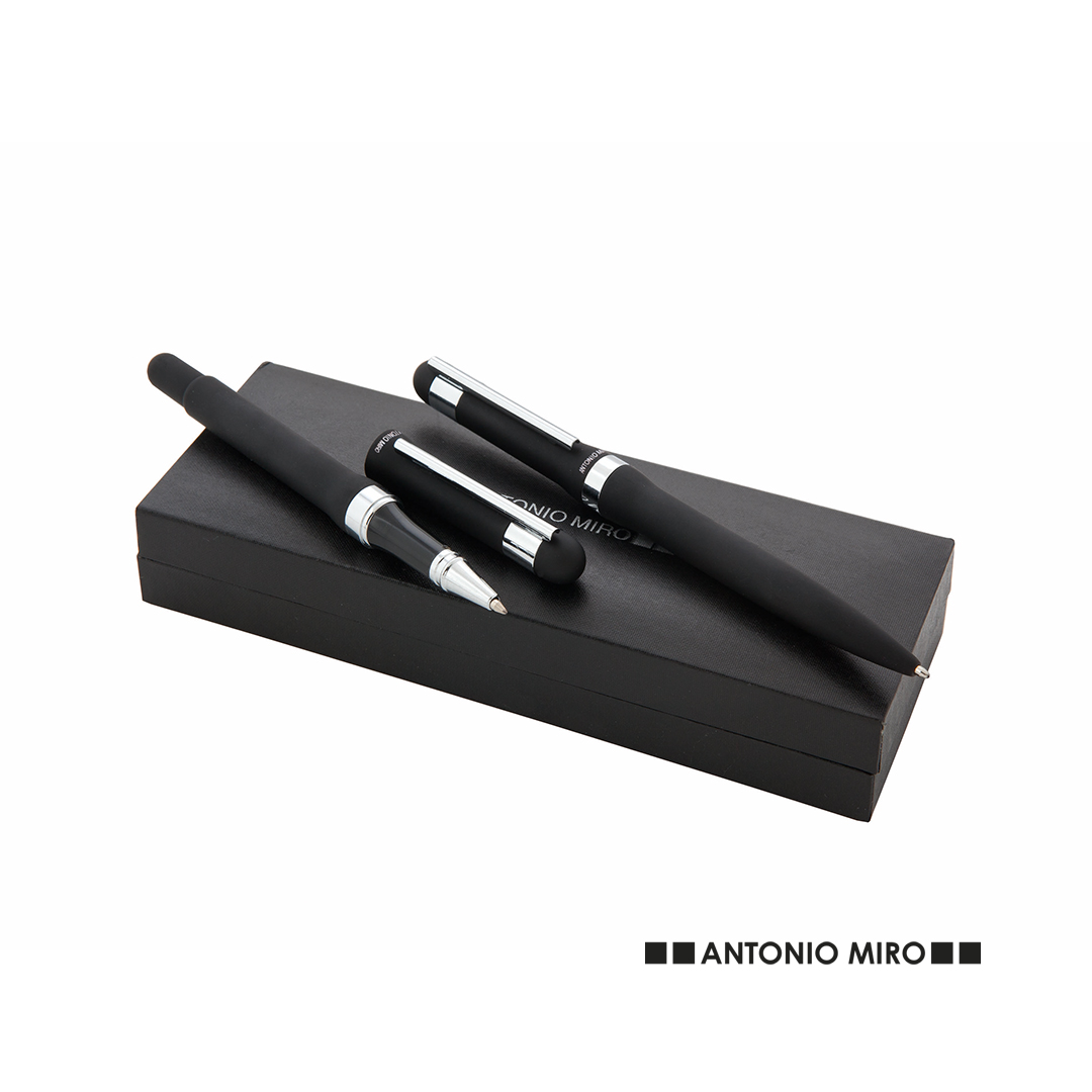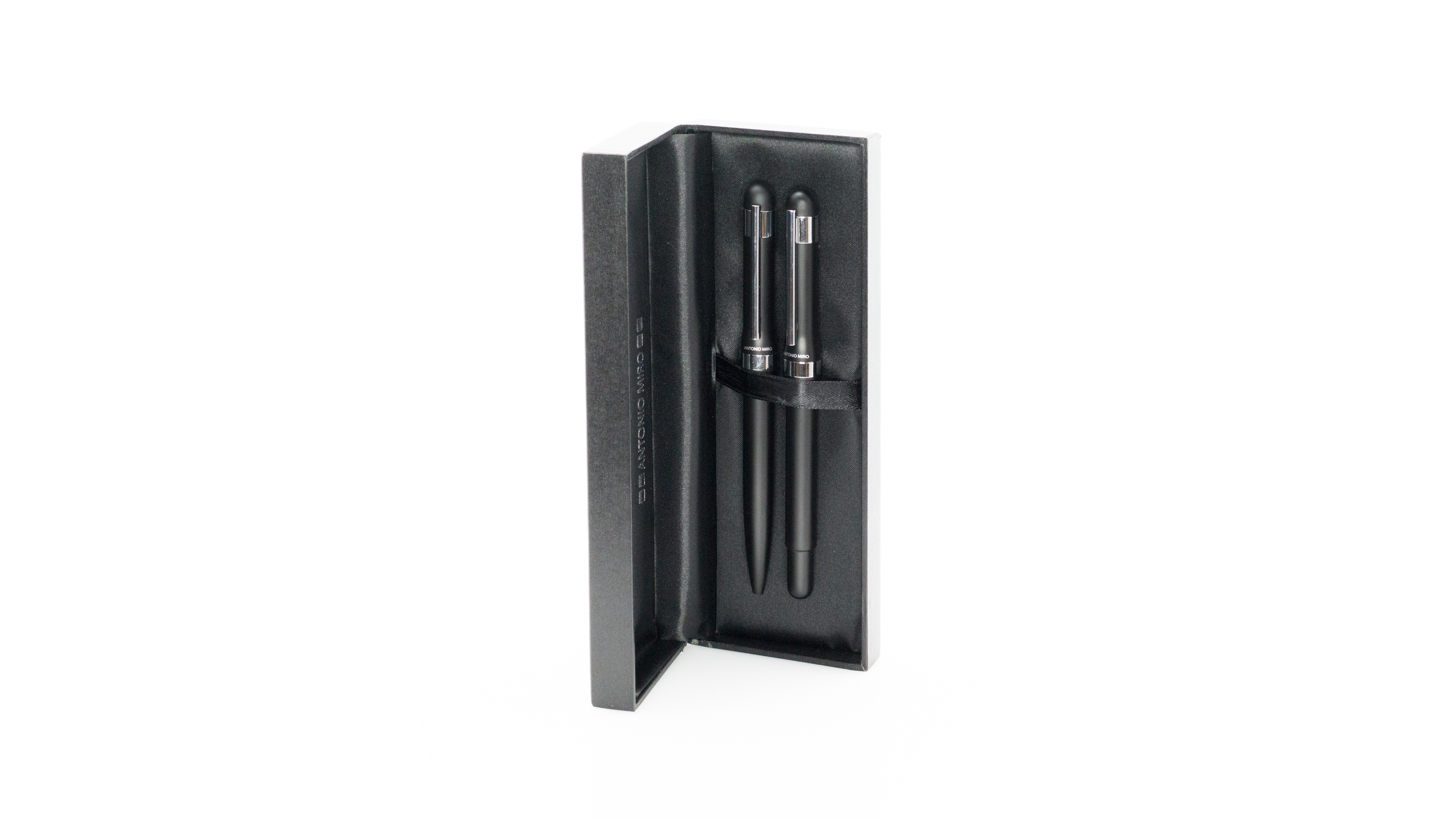 Elegantes Set von Antonio Miró aus Dreh-Kugelschreiber und Tintenroller mit originellem Ring und schlichtem Design. Metallschaft in glänzendem Schwarz mit silbernem Clip. Präsentiert in einer eleganten Schachtel in Schwarz mit dem Markenlogo - in einer Hülle. Blaue Tinte.