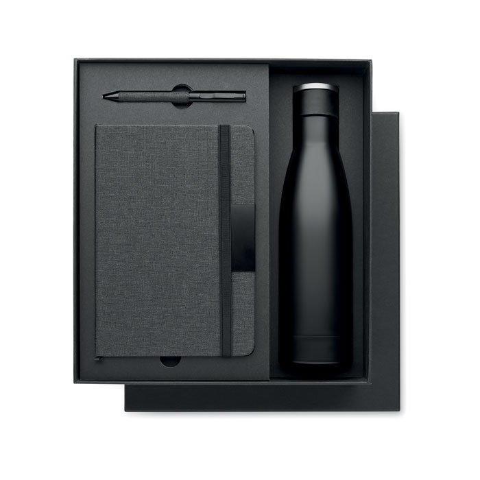 Elegantes 3teiliges Geschenk-Set: DIN A5 Notizbuch mit gebundenem Hard Cover aus RPET. 80 Blatt ( 160 Seiten) liniertes Recyclingpapier. Elastisches Verschlussband, Stiftschlaufe und Lesebändchen. Passender Drehkugelschreiber. Doppelwandige Isolierflasche aus Edelstahl. Füllmenge: 500 ml. Lieferung in Geschenkbox. FSC®-certified | FSC MIX CREDIT, P7.1, FSC-C213206