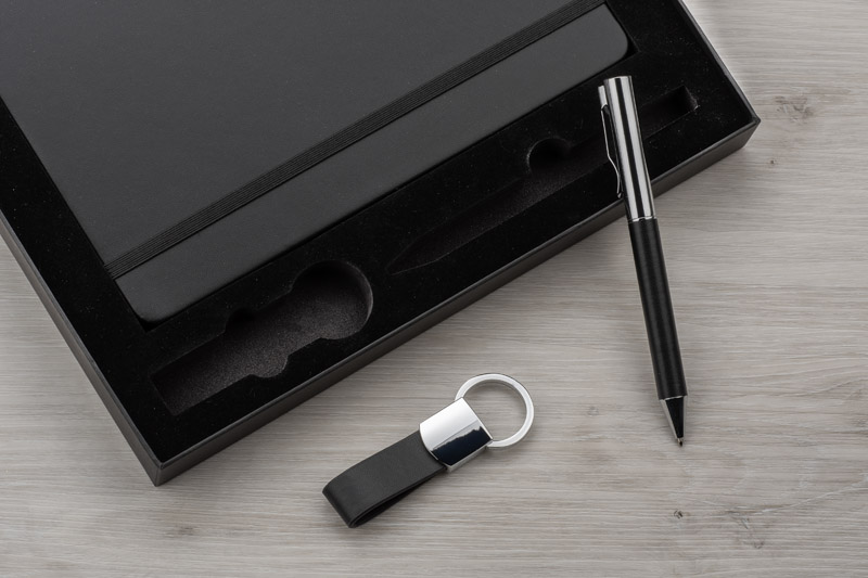 Das PROBIZ-Set besteht aus einem Notizbuch, einem Stift und einem Schlüsselanhänger. Das Notizbuch hat glatte Seiten aus Steinpapier, Format A5. Der Schlüsselanhänger ist aus Metall und lederähnlichem Material (PU). Kugelschreiber mit blauer Tintenmine. Das ganze Set ist in einer geschmackvollen schwarzen Schachtel verpackt. Das Set sieht sehr elegant aus. Produktabmessungen: 145 x 210 x 13 mm (Notizbuch); 132 x ⌀ 10 mm (Stift); 62 x 20 x 9 mm (Schlüsselanhänger); 210 x 260 x 30 mm (Box).