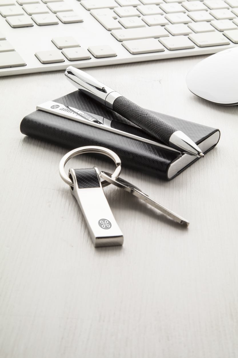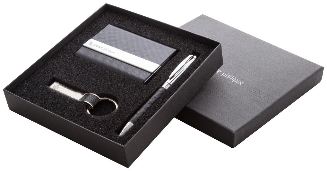 Elegantes Set mit Kugelschreiber (schwarzschreibend), Visitenkartenetui und Schlüsselanhänger. Material: Metall und Kunstleder. André Philippe Markenprodukt.