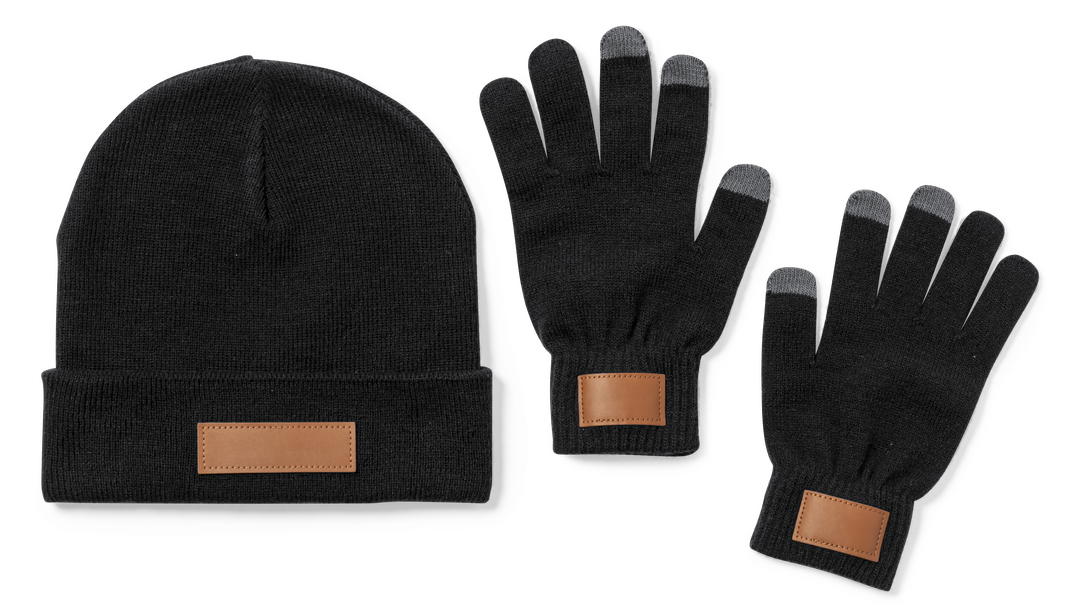 Set aus Mütze und Handschuhen in Erwachsenengröße, aus elastischem Acrylmaterial und mit einem aufgenähten PU-Patch zum Branding. Lieferumfang: Paar Handschuhe mit 3 Tastfingern und elastischer Handgelenksregulierung. Passender Hut mit Saum.