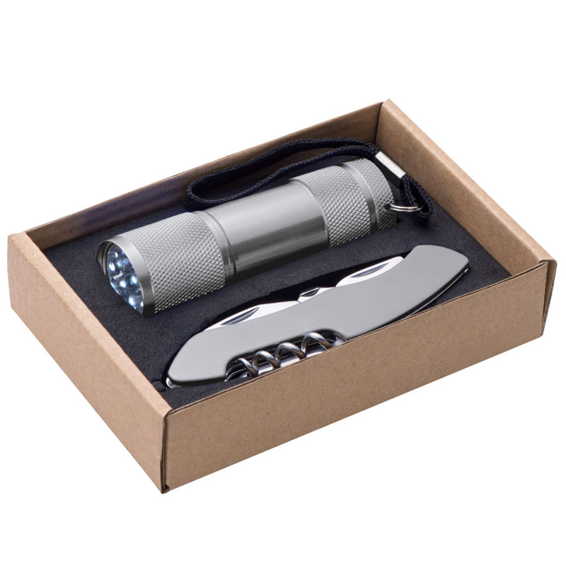 Set bestehend aus einer Aluminiumtaschenlampe mit neun LEDs und einem Taschenmesser. Ihre Werbung lasern wir auf die Taschenlampe und das Taschenmesser in gleicher Größe. Inklusive drei AAA-Batterien.