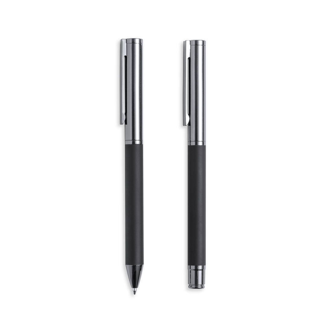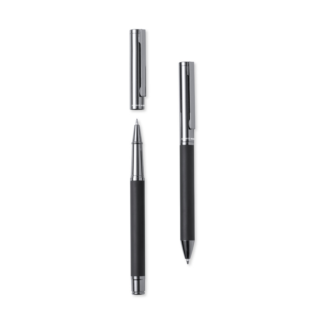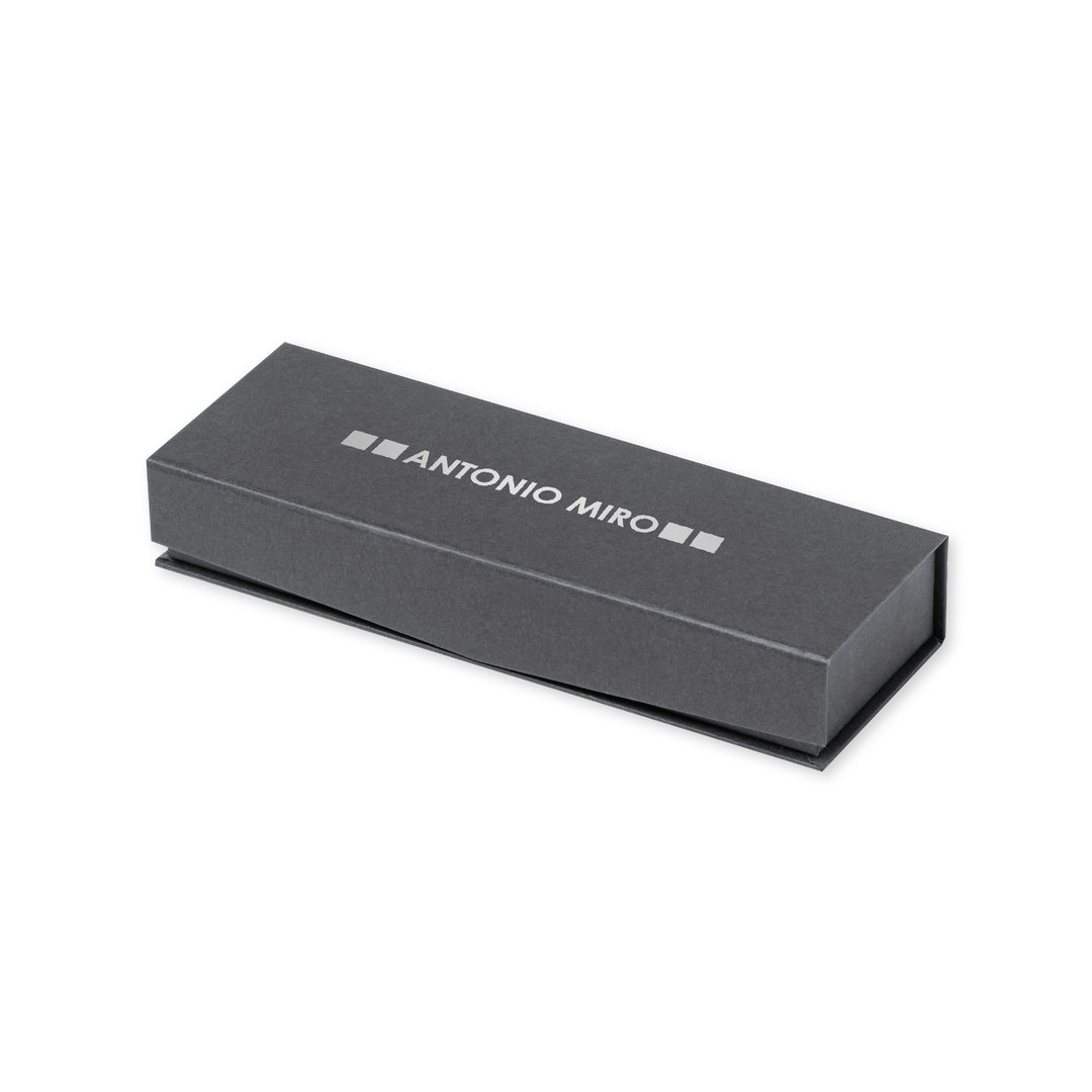 Antonio Miró Kugelschreiber- und Rollerball-Set. Enthält:Kugelschreiber aus Metall mit mattschwarzem Schaft. Verchromte Beschläge und Kappe mit Markenlogo Jumbo-Patrone und blauschreibender Tinte. Metallischer Tintenroller mit mattschwarzem Schaft. Verchromte Beschläge und Kappe mit Markenlogo. Jumbo-Patrone und blauschreibender Tinte. Präsentiert in einem eleganten und widerstandsfähigen schwarzen Einzeletui mit Antonio-Miro-Logo, Magnetverschluss und passender Schutzhülle.