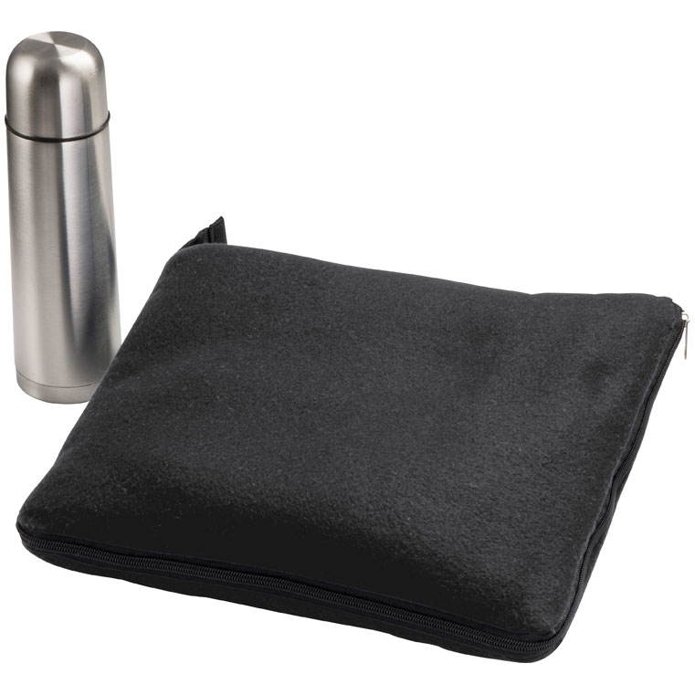Geschenkset bestehend aus Thermoskanne (Edelstahl) mit Becher (Fassungsvolumen 500ml) und einer 2in1 Fleecedecke (180 x 120 cm) die sich zusammenfalten und mit dem Reißverschluss zum Kissen schließen lässt. Ihre Werbung gravieren wir auf die Thermoskanne.