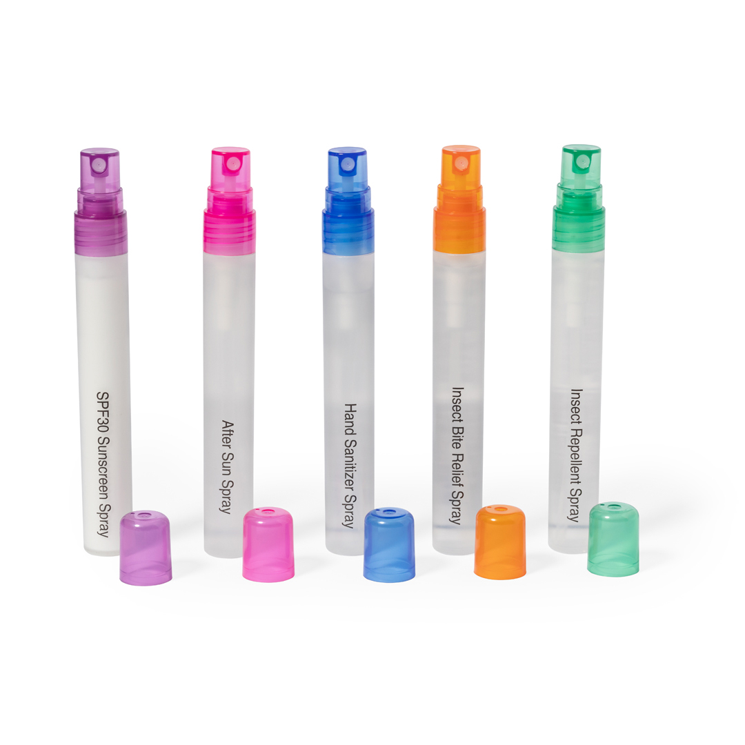 Sonnenschutz- und Abwehrmittel-Set, komplett und leicht zu transportieren. Das Set enthält Sonnenschutzspray mit Lichtschutzfaktor 30, Feuchtigkeitscreme nach dem Sonnenbad, hydroalkoholisches Gel, Insektenschutzmittel und eine Lösung zur Linderung des durch Stiche verursachten Juckreizes. Dermatologisch getestet und in einer transparenten Kunststoffbox präsentiert.