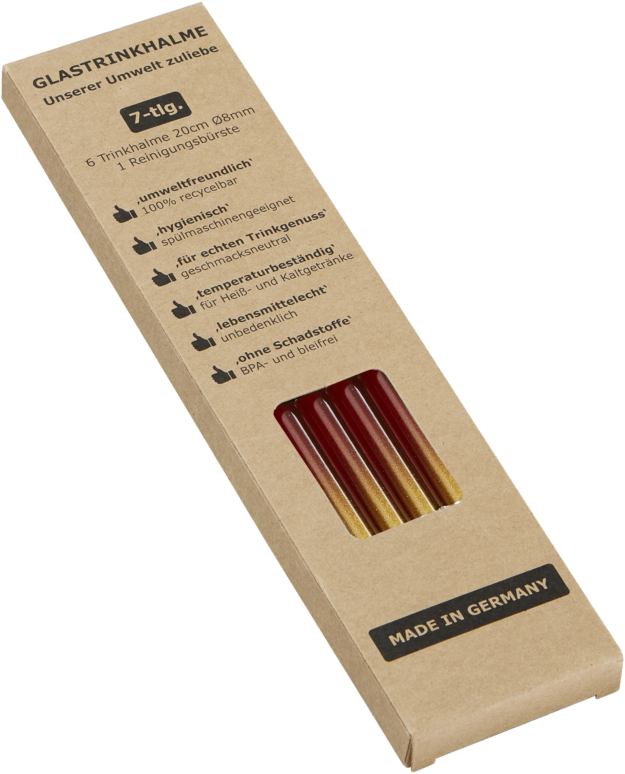 Dieser Halm ist ein Bekenntnis zu Nachhaltigkeit und Umweltbewusstsein. Die Halme sind 100 % recycelbar, patentiert lebensmittelecht beschichtet, BPA- und bleifrei, spülmaschinengeeignet, geschmacksneutral und für Heiß- oder Kaltgetränke gleichermaßen geeignet. Ab 10.000 Stück (= 1.667 Sets) in jeder Nationalfarbe oder Ihrem Wunschfarbton erhältlich! Material: Getempertes Glas, verzinkter Stahl (Bürste), Nylon (Bürstenbesatz) Verpackung: Plastikfreie Einzelverpackung Maße eines Trinkhalms: L 200 x Ø 8 mm Maße der Verpackung: H 203 x B 52 x T 11,5 mm Gewicht ohne Verpackung (6 Trinkhalme und Bürste): 74 g Werbeanbringung: Auf dem Trinkhalm 5 x 40 mm (L6) ab 300 Halmen (50 Sets); Dieses Produkt unterstützt aktiv den Ausgleich der entstehenden CO2-Emissionen durch zertifizierte Klimaschutzprojekte.