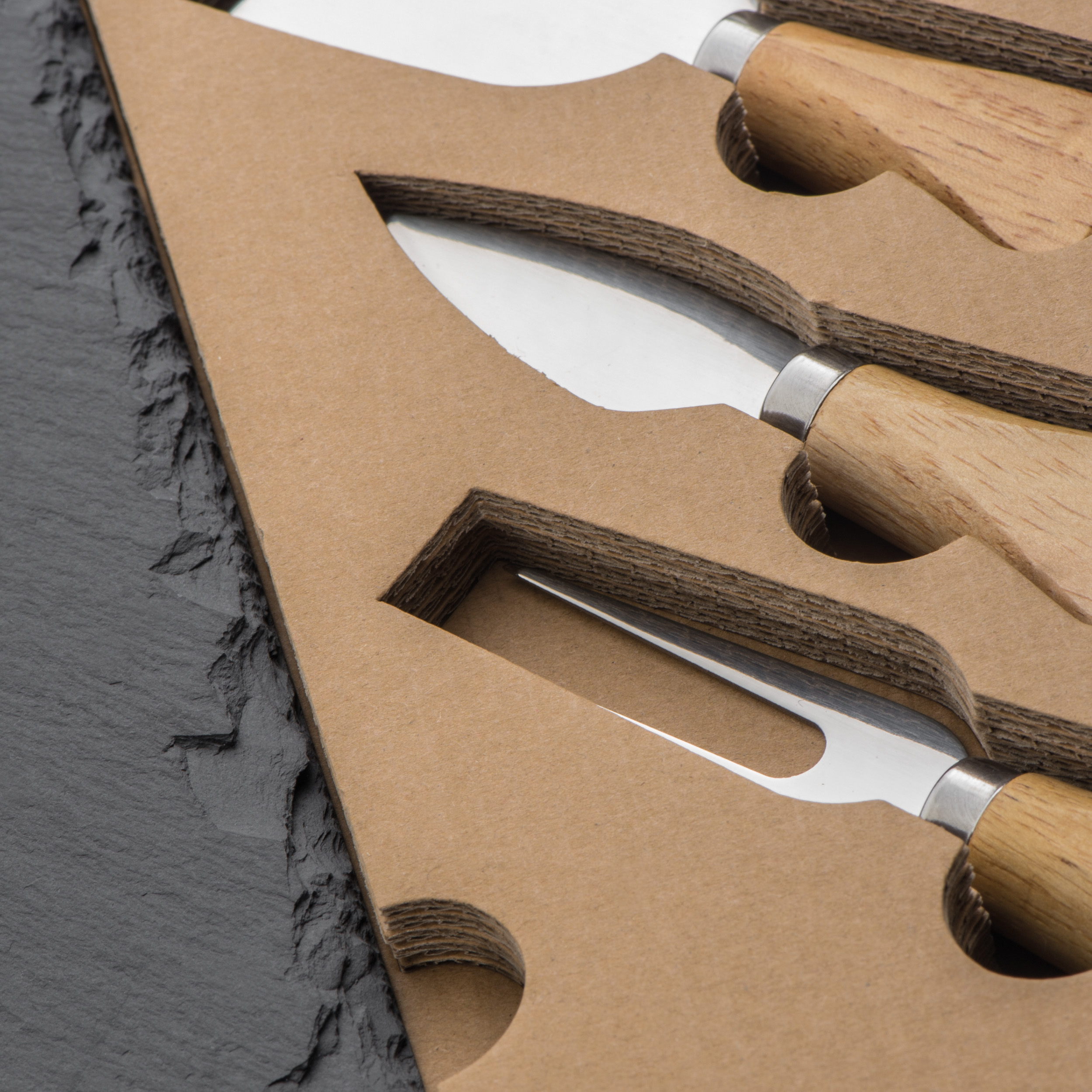 Käseset mit einer Schieferplatte, einem kleinen und einem flachen Käsemesser sowie einer Käsegabel aus Edelstahl, in einer Geschenkverpackung. Die Werbung wird auf die Schieferplatte gelasert.
