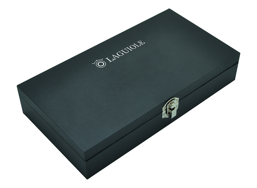 Set mit 6 lebensmittelechten Laguiole Steakmessern (feste Klinge) aus Edelstahl. Entspricht den Lebensmittelnormen (martensitische Stahlnorm EB10088-2-2005). 11 cm Gezahnte Klinge. Griff aus Zebra-Holz. Geliefert in einer schwarzen MDF-Geschenkbox.