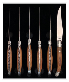 Klingen aus rostfreiem 420er Edelstahl für den Lebensmittelgebrauch (martensitischer Stahl gemäß Norm EN10088-2 2005). Zwei durchgehende Heftbacken aus Edelstahl. Griffe aus Olivenholz. Wird in einer Geschenkbox geliefert. Warnung: Dieses Produkt ist nicht spülmaschinengeeignet. Die Vorteile in Kürze: - Klingen aus 420er martensitischem Edelstahl für optimale Festigkeit und perfekte Lebensmittelkonformität. - Griffe aus Olivenholz das diesem Klassiker der Messerkunst einen authentischen und regionalen Charakter verleiht. - Präsentiert in einer eleganten Geschenkbox.