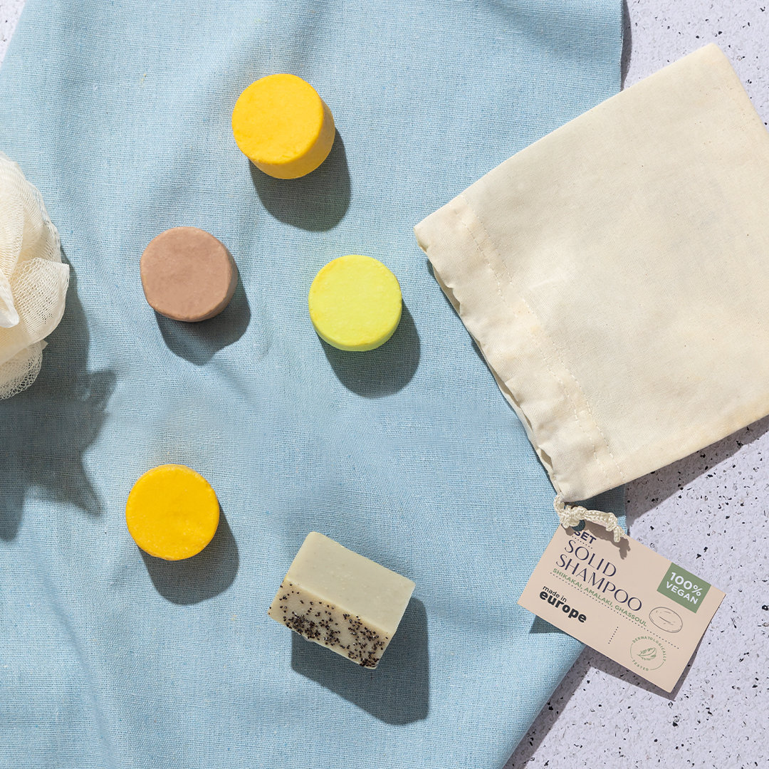 Veganes Shampoo-Set. Inhalt:1 x 30 g festes Shikakai-Shampoo mit einer Auswahl an Wirkstoffen wie nativen Oliven, Bio-Sheabutter, Karotten- und Shikakai-Pflanzenextrakten. Es ist reich an Vitamin E und verleiht dem Haar Sauberkeit, Geschmeidigkeit und Vitalität. Angenehm duftend, um einen Zustand von innerem Vergnügen und Wohlbefinden zu erreichen.1 x Amalaki 30g festes Shampoo mit Pflanzenextrakten und Gewürzen. Angereichert mit Kurkuma, Amalaki, Avocado, Olive, Jojoba, Damaszener Rose, weißer Grapefruit und Orange für tiefe Hydratation und beeindruckenden Glanz.1 x 30 g Ghassoul Festes Shampoo mit Ghassoul aus Marokko, das Geschmeidigkeit, Volumen und Glanz verleiht, ohne das natürliche Keratin zu verändern. Reich an Sheabutter, die Feuchtigkeit und Geschmeidigkeit spendet. Mandarine verleiht ihm Glanz und ätherische Öle aus Weihrauch, Geranie, Lavendel und Rose verleihen ihm einen betörenden Duft, der Sie in einen Zustand der Ausgeglichenheit und Ruhe versetzt. Präsentiert in einem individuellen Baumwollbeutel mit Kordelzugverschluss und unverwechselbarem Etikett. Dermatologisch getestet und in Europa hergestellt. Nachhaltiges und 100% veganes Produkt ohne tierische Inhaltsstoffe. Darüber hinaus wurden diese Produkte nicht an Tieren getestet, was den Schutz und die Achtung aller Tiere fördert.