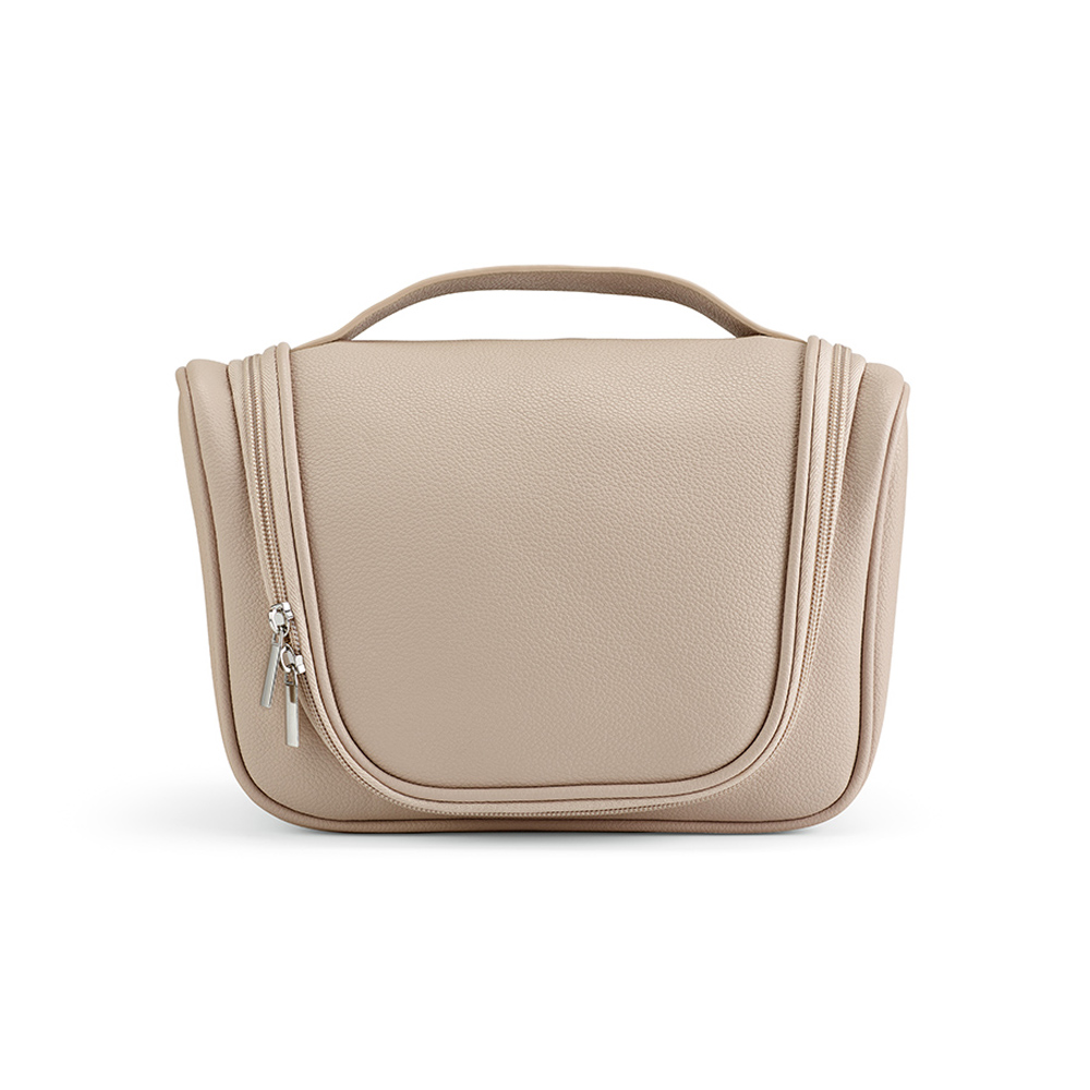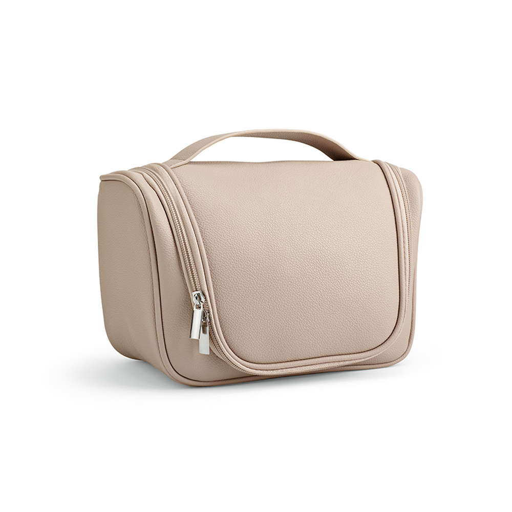 Shanghai Hängekulturtasche aus recyceltem PU (5 L) mit Tragegriff. Ausgestattet mit einem großen Hauptfach, kleineren Fächern für Flaschen sowie einer Netztasche an der Innenseite der Klappe zur zusätzlichen Aufbewahrung von wichtigen Utensilien. Elegante Reißverschlüsse sorgen für sicheren Verschluss, und ein Metallhaken ermöglicht das Aufhängen an der Tür. Einzeln verpackt in einem biologisch abbaubaren Polybeutel.