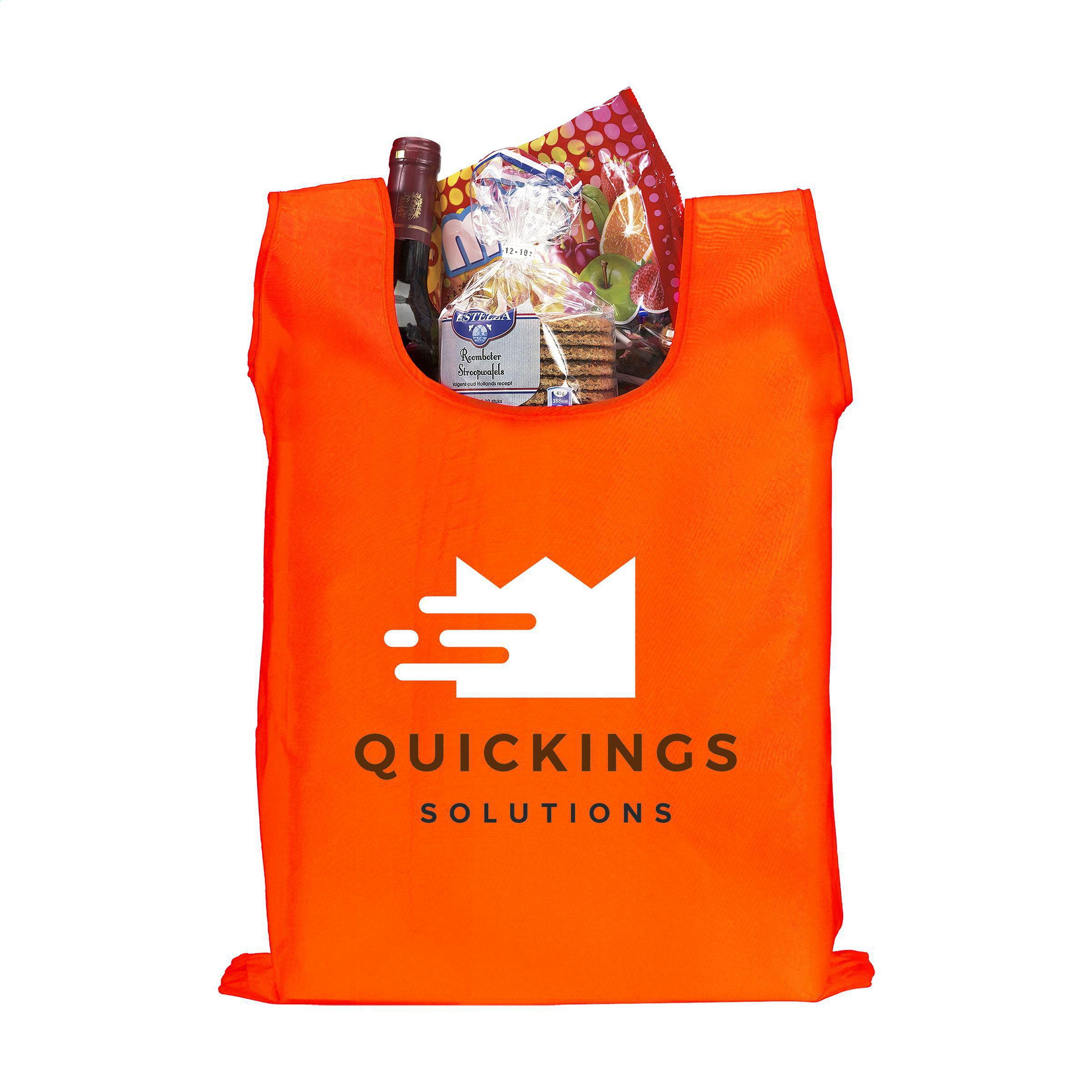 Faltbare Einkaufstasche aus 190T Polyester. Mit Aufbewahrungshülle mit Druckknopf und Karabinerhaken. Die Tasche wird ungefaltet mit separatem Beutel geliefert. Maße gefaltet: 6 x 2,5 x 12,5 cm. Fassungsvermögen ca. 8 Liter