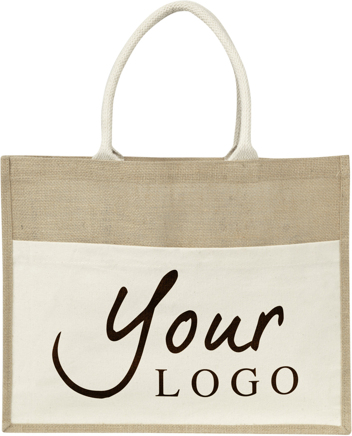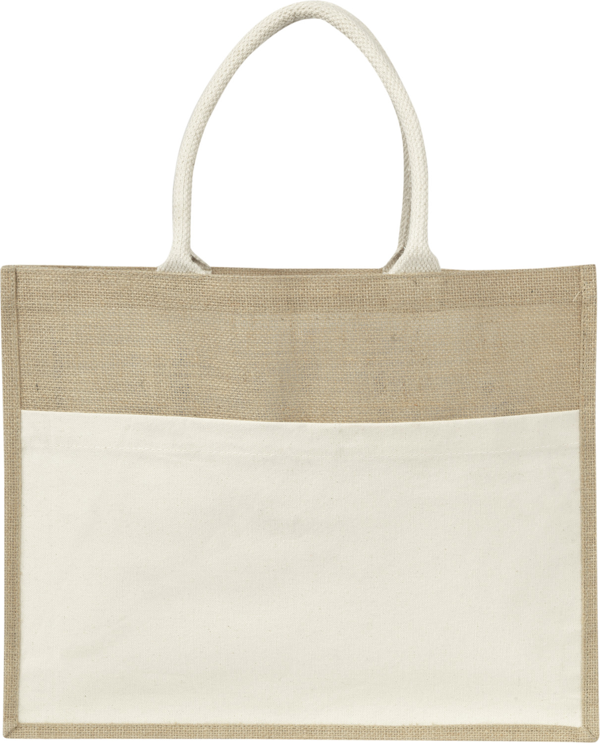 Shopper aus Jute, mit Frontfach, 9,5 cm Boden- und Seitenfalte und kurzen Henkeln.