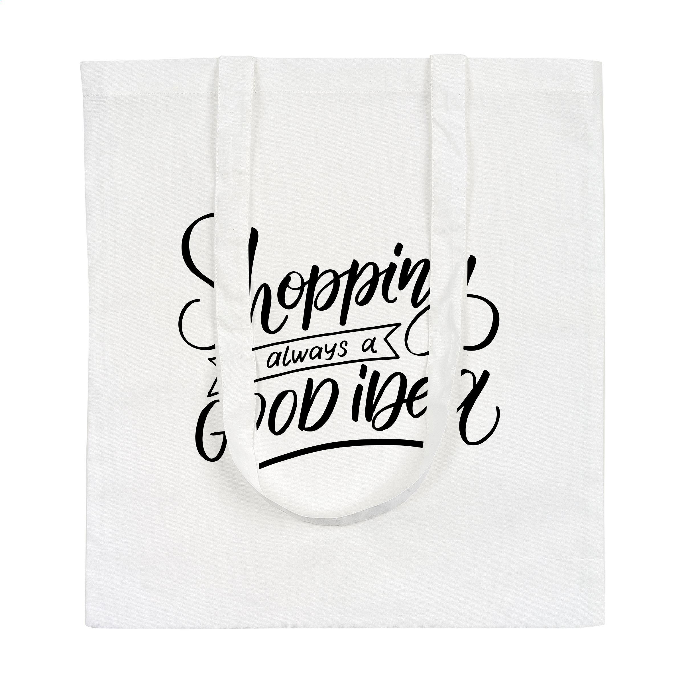 Einkaufstasche mit langen Henkeln aus 100% festgewebter Baumwolle (120 g/m²). Fassungsvermögen ca. 8 Liter.