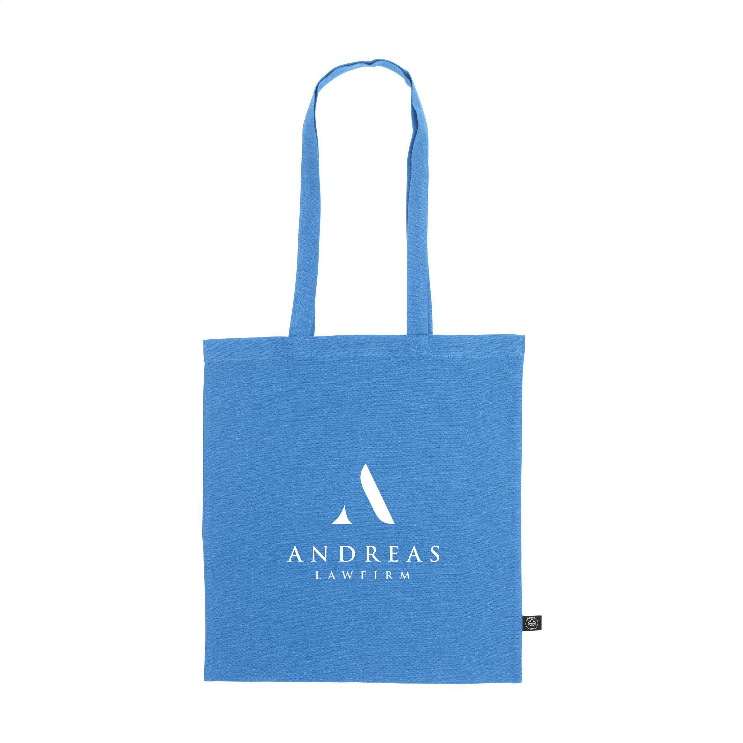 Einkaufstasche mit langen Griffen aus 80% recycelter Baumwolle und 20% recyceltem Polyester (150 g/m²). GRS-zertifiziert. Recyceltes Material insgesamt: 100%. Fassungsvermögen ca. 8 Liter.