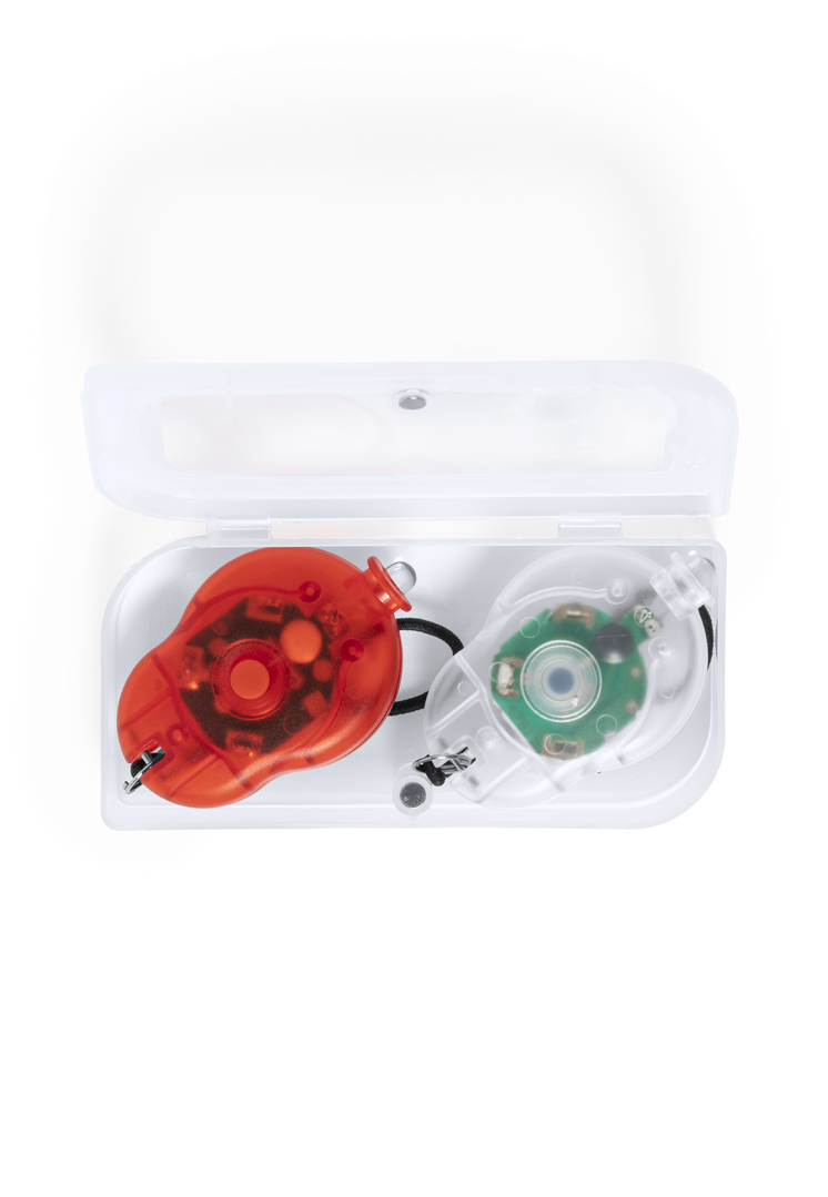 Set aus LED-Sicherheitsleuchten für Fahrräder. Inklusive 2 Stück, mit zwei Lichtpositionen und präsentiert in einem widerstandsfähigen Einzelgehäuse mit Magnetverschluss. Batteriebetrieben (Knopfzellen enthalten).