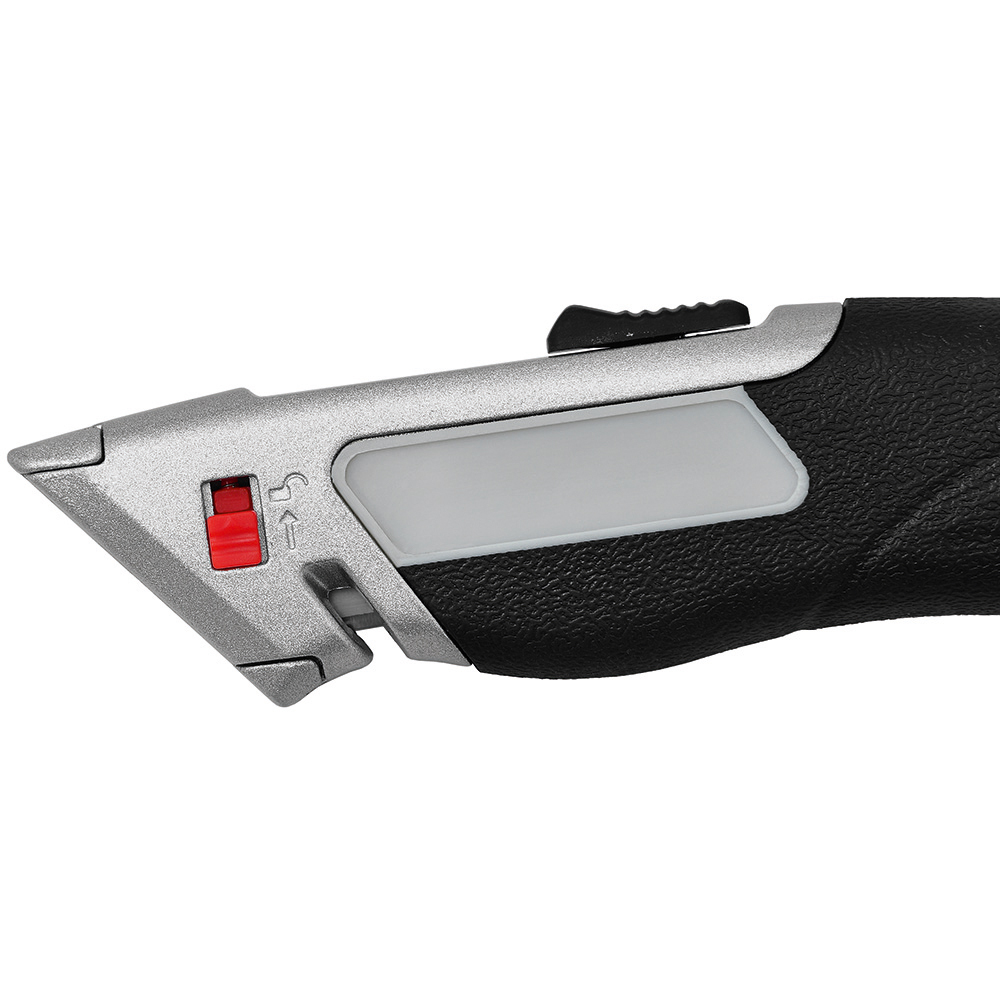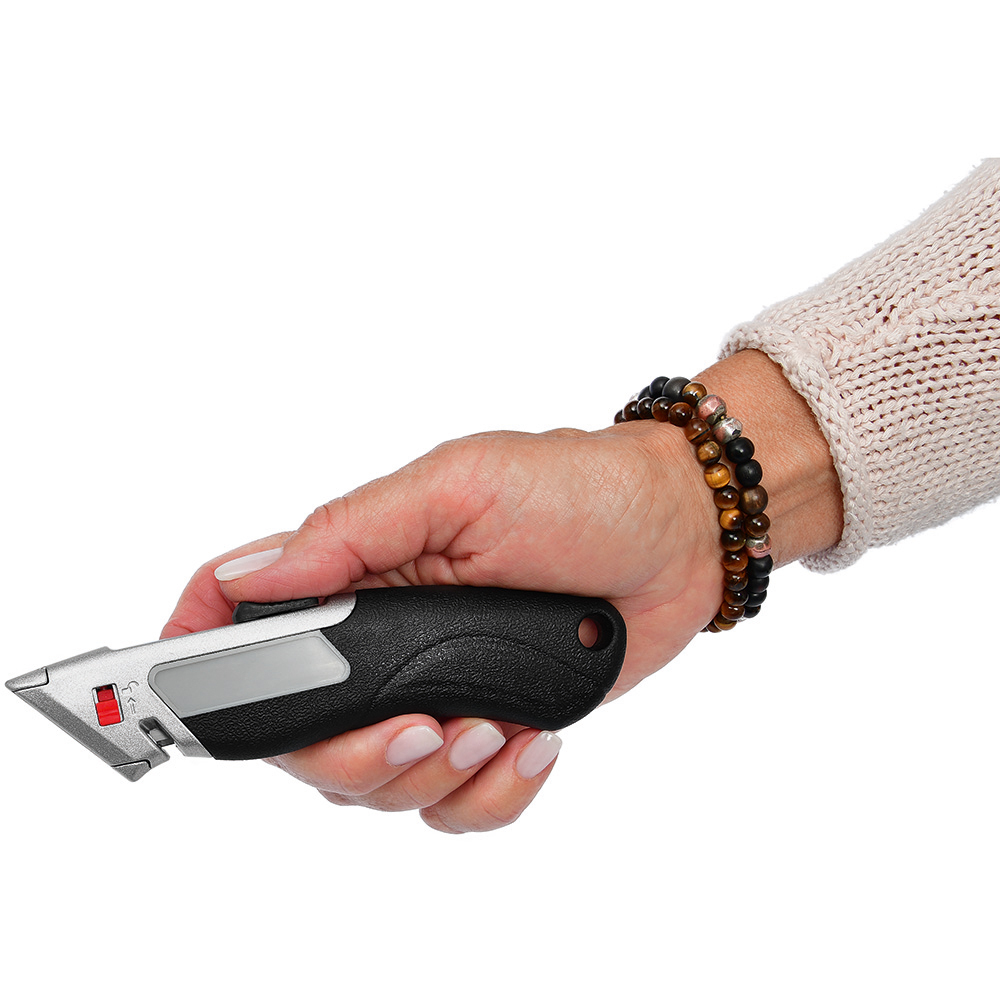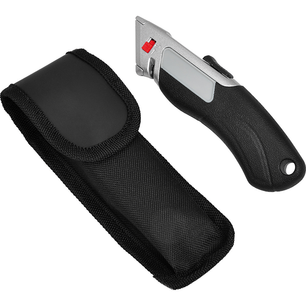 Sicherheitsmesser mit vollautomatischem Klingenrückzug. Dieses Sicherheitsmesser eignet sich im Besonderen zum Schneiden von festem, stärkerem bzw. dickerem Material. Die Klinge ist federbelastet. Sobald sie keinen Kontakt mehr zum Schneidematerial hat, springt sie automatisch zurück in das Gehäuse. Für Rechts- und Linkshänder geeignet. Material: Gehäuse aus Zinklegierung, 2-Komponenten-Griff aus ABS und TPR. Klinge: Trapezklinge aus SK5 Carbonstahl, Rockwell 58~62 HRC (mittlere Qualitätsstufe), max. Schnitttiefe 27 mm, 2-fach verwendbar durch 2-seitigen Schliff. Funktionen: Klingenwechsel ohne Hilfsmittel, Paketbandschneider mit abgedeckter Klinge, Öse zum Anbringen eines Lanyards oder Fangriemen. Zubehör: Nylon-Gürteltasche. Verpackung: schwarze Geschenkverpackung.