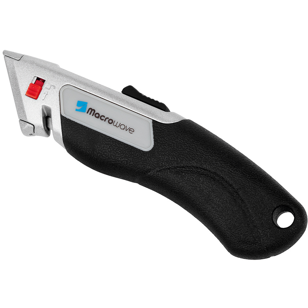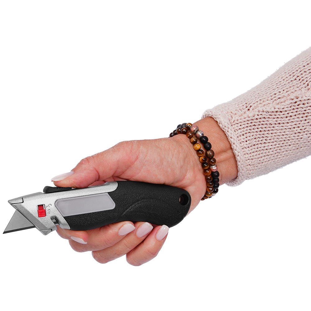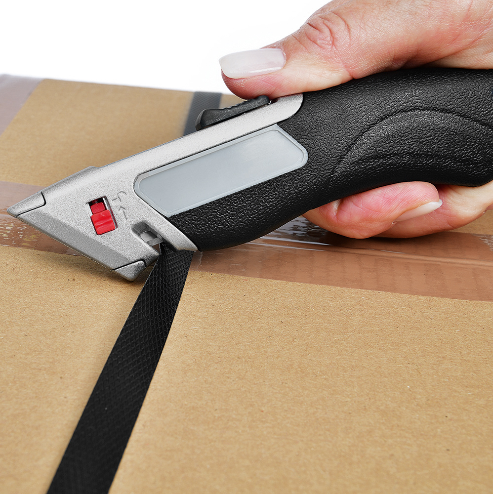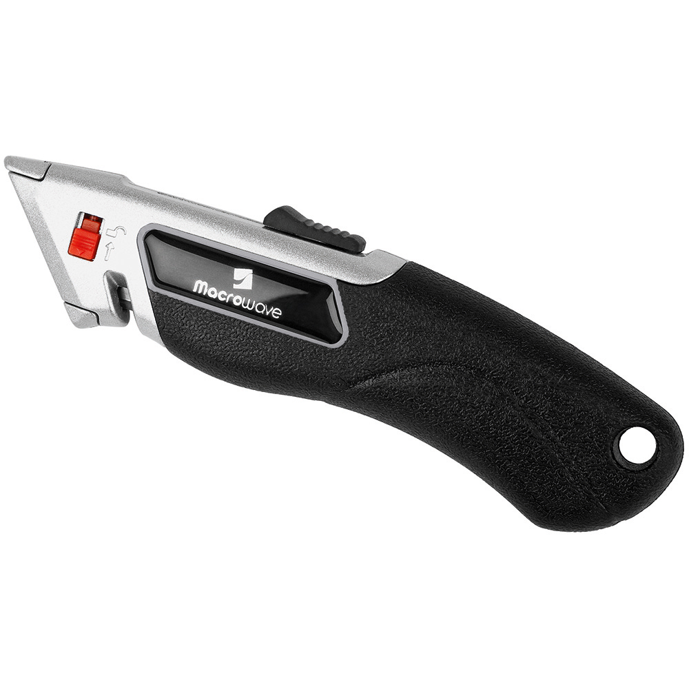Sicherheitsmesser mit vollautomatischem Klingenrückzug. Dieses Sicherheitsmesser eignet sich im Besonderen zum Schneiden von festem, stärkerem bzw. dickerem Material. Die Klinge ist federbelastet. Sobald sie keinen Kontakt mehr zum Schneidematerial hat, springt sie automatisch zurück in das Gehäuse. Für Rechts- und Linkshänder geeignet. Material: Gehäuse aus Zinklegierung, 2-Komponenten-Griff aus ABS und TPR. Klinge: Trapezklinge aus SK5 Carbonstahl, Rockwell 58~62 HRC (mittlere Qualitätsstufe), max. Schnitttiefe 27 mm, 2-fach verwendbar durch 2-seitigen Schliff. Funktionen: Klingenwechsel ohne Hilfsmittel, Paketbandschneider mit abgedeckter Klinge, Öse zum Anbringen eines Lanyards oder Fangriemen. Zubehör: Nylon-Gürteltasche. Verpackung: schwarze Geschenkverpackung.
