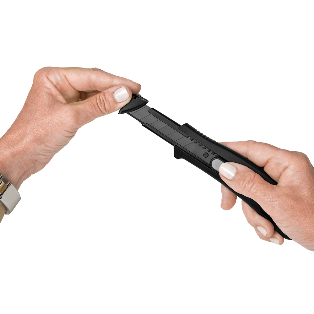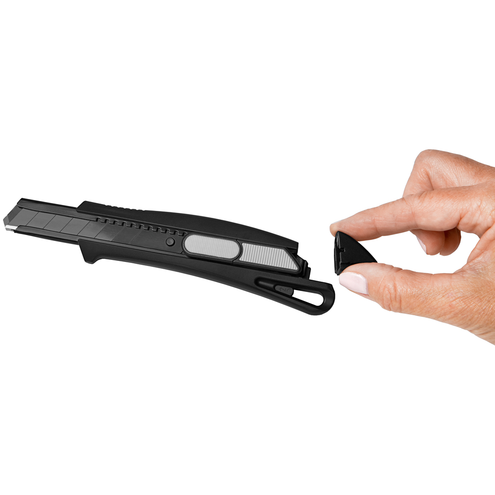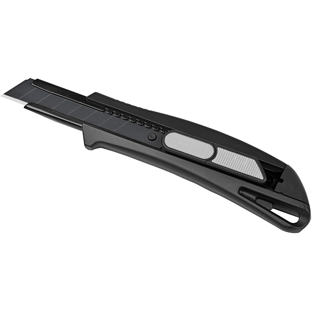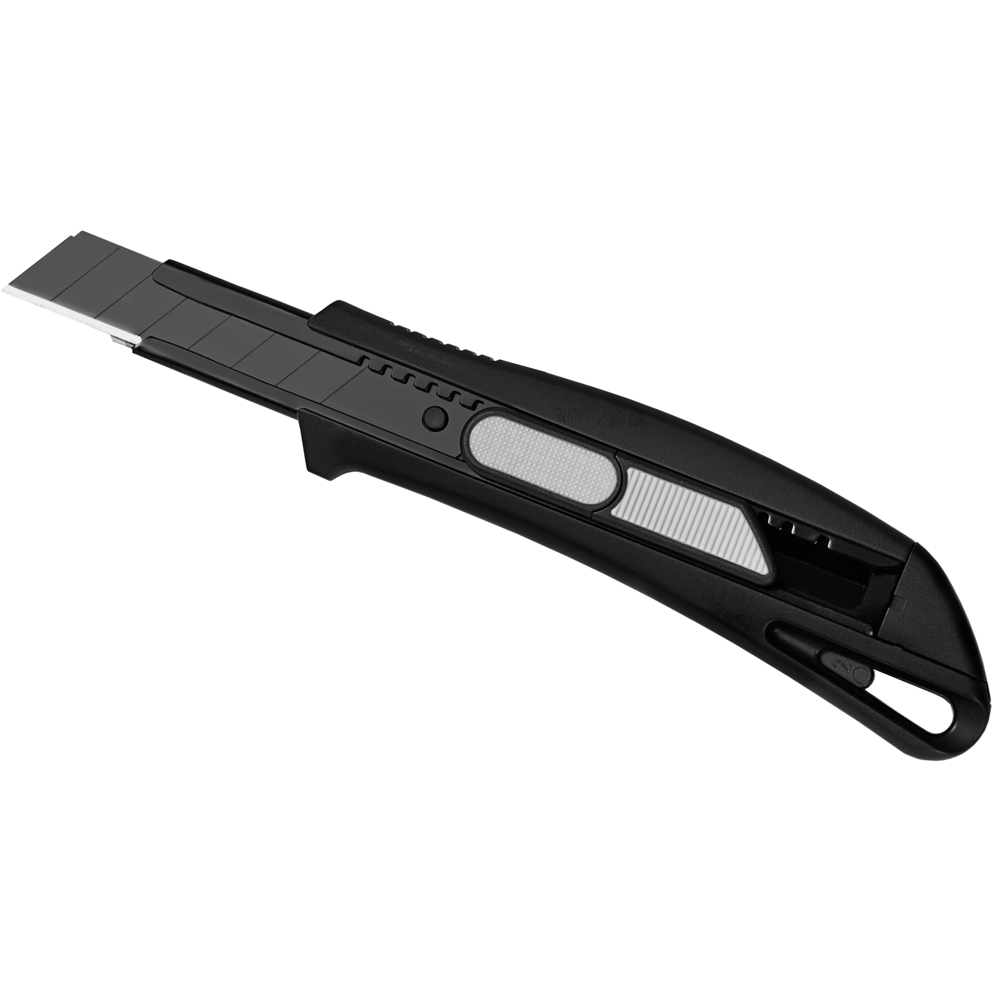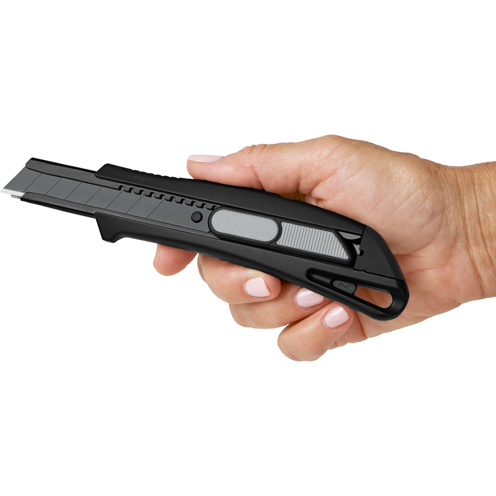 Das Sicherheitsmesser erfüllt höchste Ansprüche im Bereich Arbeitsschutz und Arbeitssicherheit. Es ist ein 2-Funktionen-Messer: Der integrierte Federrückzug sorgt für automatischen Klingenrückzug. Alternativ ist ebenso die feststehende Nutzung mittels Rasterautomatik möglich. Die Spitze der Klingenführungsschiene ist gehärtet, sodass diese auch als Farbdosenöffner, Notschraubendreher, oder als Schnellschneider für Paketklebeband, usw. ohne die Klinge ausfahren zu müssen, verwendet werden kann. Material: schlagfestes Gehäuse aus ABS, gummierte Oberfläche matt, Klingenführungsschiene aus schwarz beschichtetem Edelstahl 430, Schieber aus TPR / ABS. Klinge: 18 mm Abbrechklinge aus SK2 Carbonstahl, Stärke 0,6 mm, Rockwell 62 HRC (gehobene Qualitätsstufe), Korrosionsschutz durch Brünieren, max. Klingenausschub 76 mm (Cuttermesser), max. Schnitttiefe 13 mm (Sicherheitsmesser), 2-seitiger Klingenschliff, 7 Abbrechsegmente für 8-fache Nutzung. Funktionen: Sicherheitsmesser mit automatischem Klingenrückzug, Cuttermesser mit feststellbarer Abbrechklinge, Endkappe zum Abbrechen der Klingensegmente, gehärtete Spitze der Klingenführungsschiene zum Verwenden als Farbdosenöffner, Notschraubendreher, Schnellschneider für Paketklebeband usw. Klingenwechsel ohne weitere Hilfsmittel, Öse zum Anbringen eines Lanyards oder Fangriemen. Zubehör: 1 Ersatzklinge mit 0,6 mm Stärke im separaten Ersatzklingenbehälter, Verpackung: schwarze Geschenkverpackung