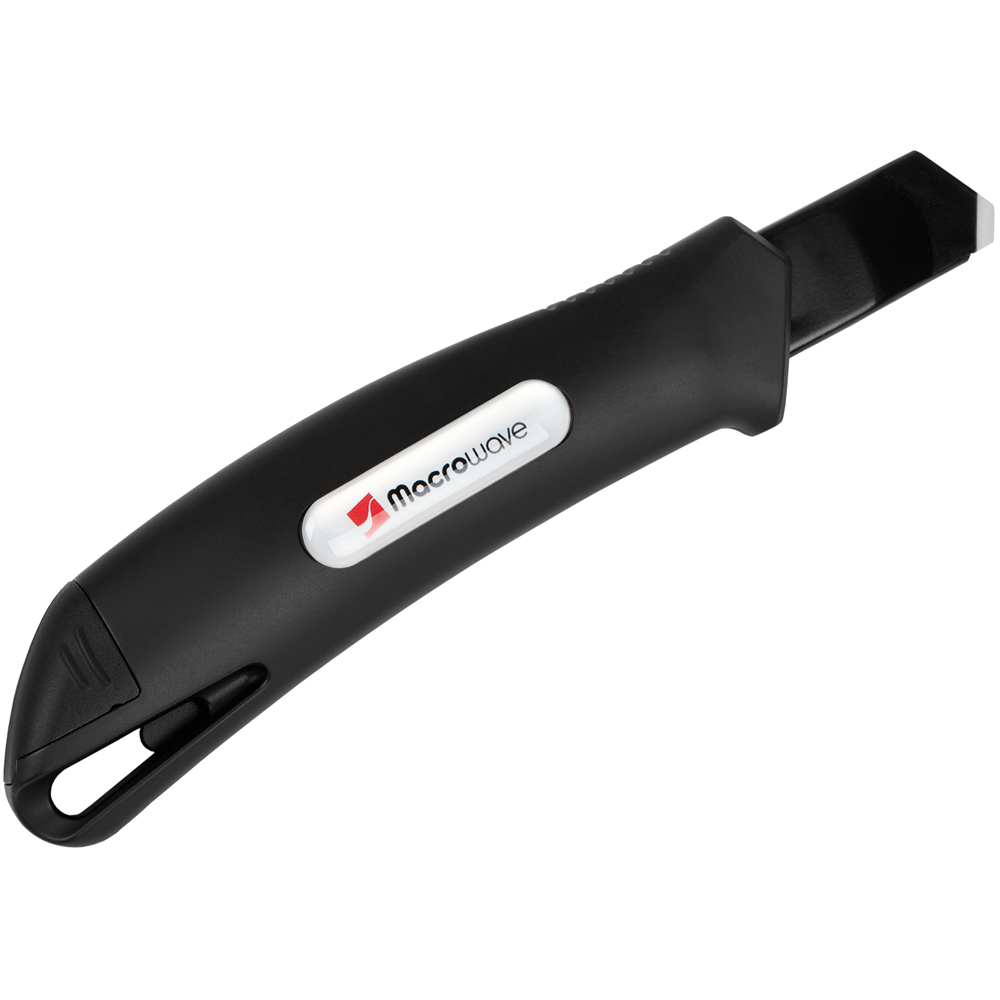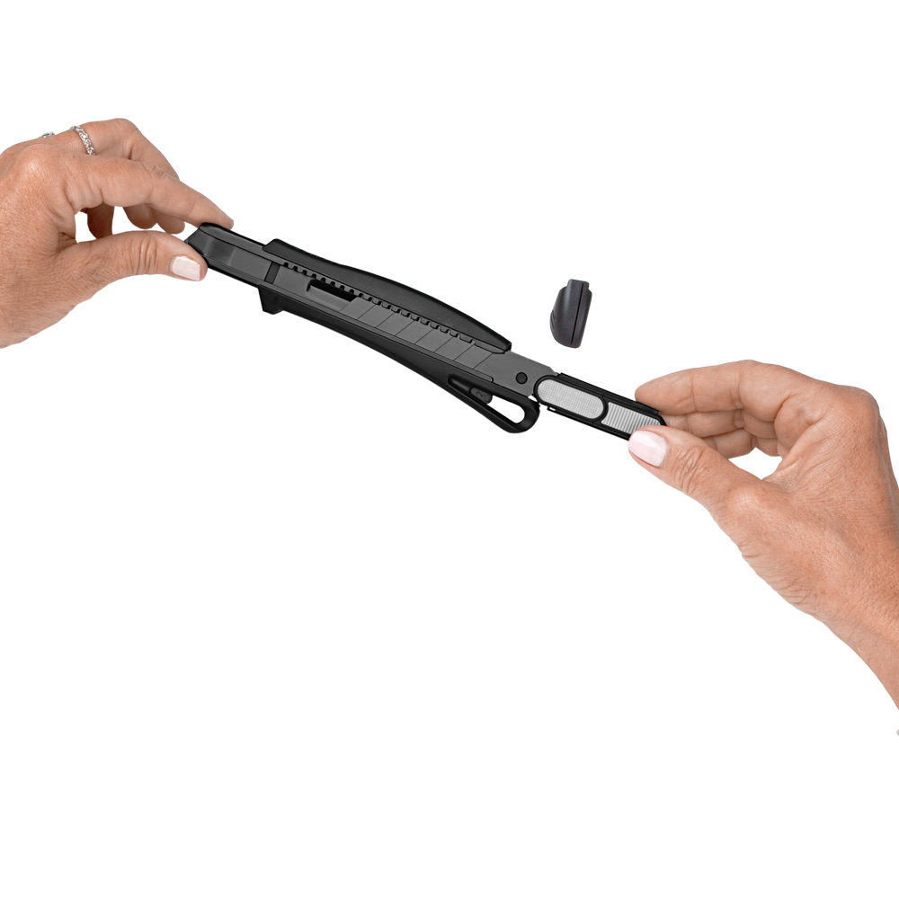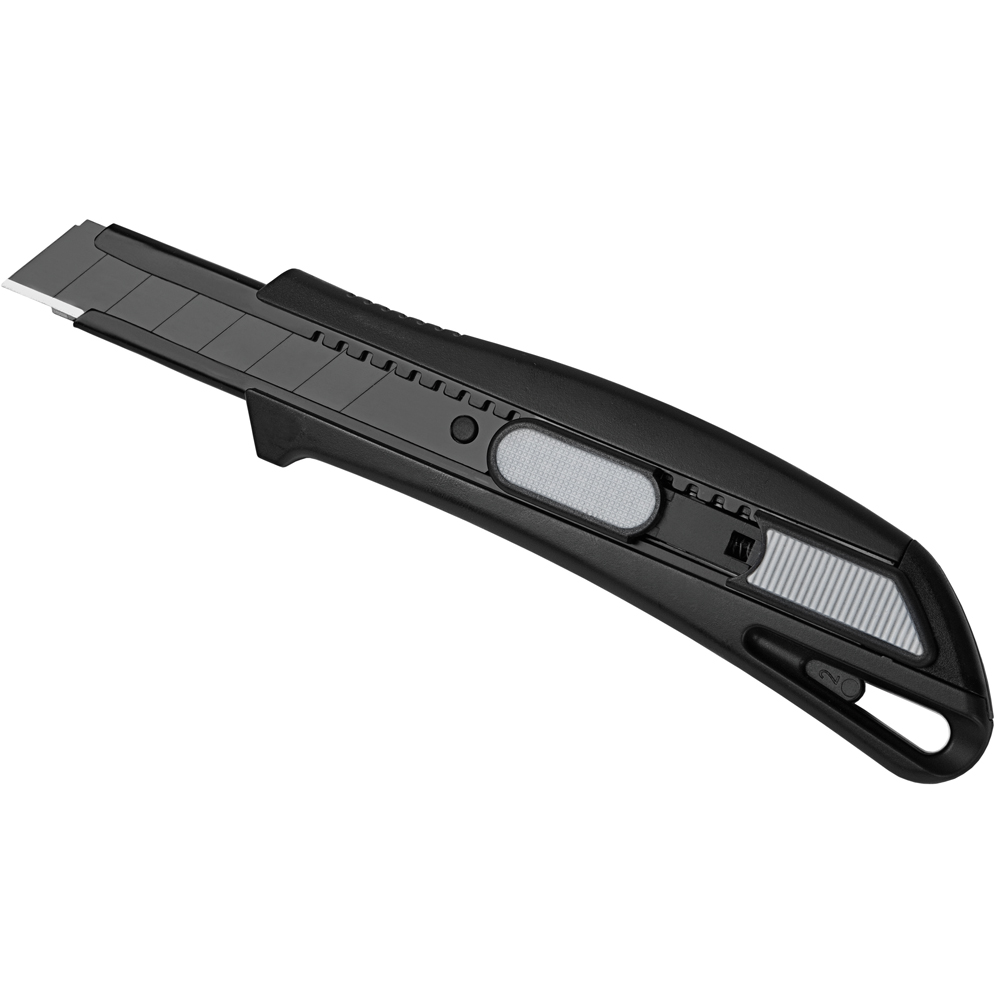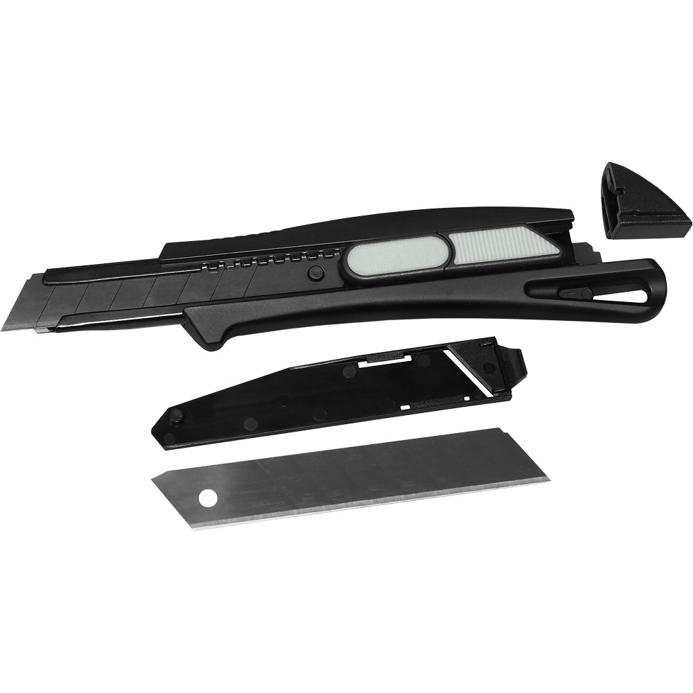 Das Sicherheitsmesser erfüllt höchste Ansprüche im Bereich Arbeitsschutz und Arbeitssicherheit. Es ist ein 2-Funktionen-Messer: Der integrierte Federrückzug sorgt für automatischen Klingenrückzug. Alternativ ist ebenso die feststehende Nutzung mittels Rasterautomatik möglich. Die Spitze der Klingenführungsschiene ist gehärtet, sodass diese auch als Farbdosenöffner, Notschraubendreher, oder als Schnellschneider für Paketklebeband, usw. ohne die Klinge ausfahren zu müssen, verwendet werden kann. Material: schlagfestes Gehäuse aus ABS, gummierte Oberfläche matt, Klingenführungsschiene aus schwarz beschichtetem Edelstahl 430, Schieber aus TPR / ABS. Klinge: 18 mm Abbrechklinge aus SK2 Carbonstahl, Stärke 0,6 mm, Rockwell 62 HRC (gehobene Qualitätsstufe), Korrosionsschutz durch Brünieren, max. Klingenausschub 76 mm (Cuttermesser), max. Schnitttiefe 13 mm (Sicherheitsmesser), 2-seitiger Klingenschliff, 7 Abbrechsegmente für 8-fache Nutzung. Funktionen: Sicherheitsmesser mit automatischem Klingenrückzug, Cuttermesser mit feststellbarer Abbrechklinge, Endkappe zum Abbrechen der Klingensegmente, gehärtete Spitze der Klingenführungsschiene zum Verwenden als Farbdosenöffner, Notschraubendreher, Schnellschneider für Paketklebeband usw. Klingenwechsel ohne weitere Hilfsmittel, Öse zum Anbringen eines Lanyards oder Fangriemen. Zubehör: 1 Ersatzklinge mit 0,6 mm Stärke im separaten Ersatzklingenbehälter, Verpackung: schwarze Geschenkverpackung