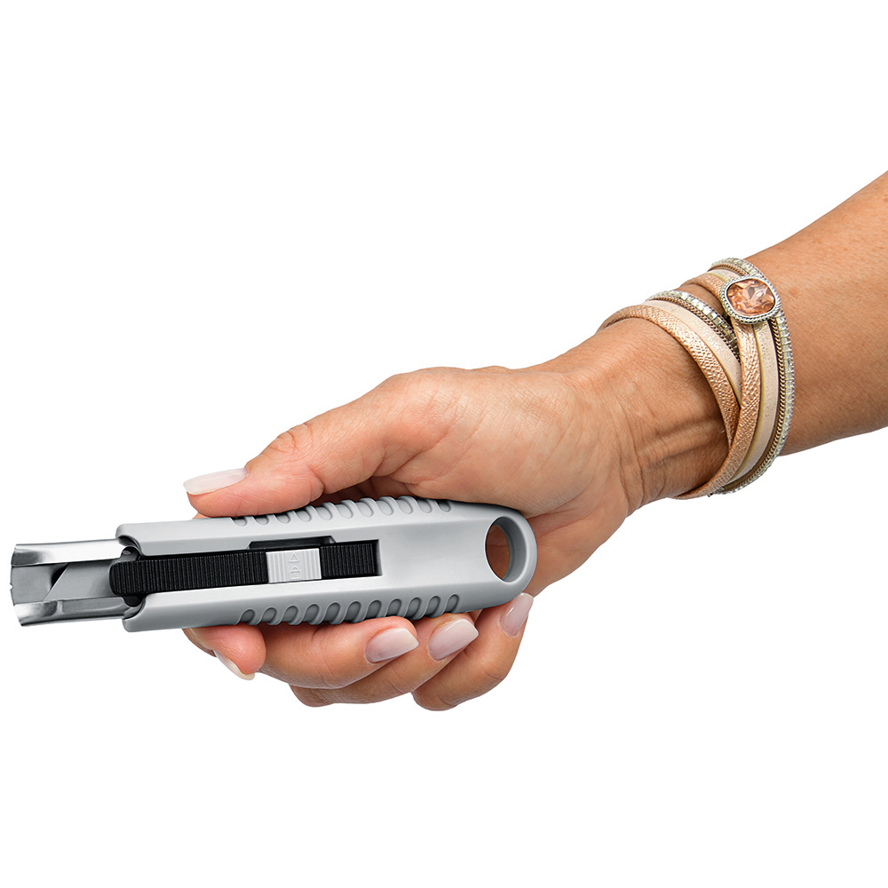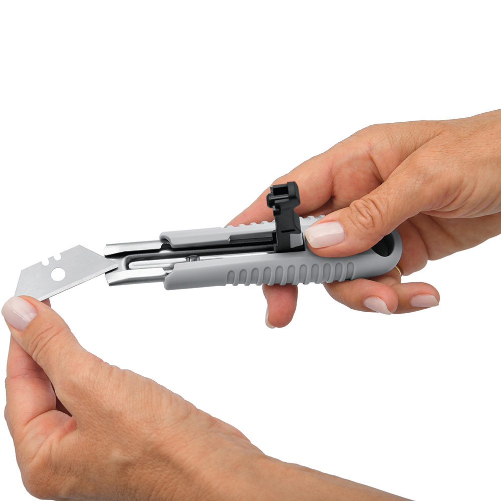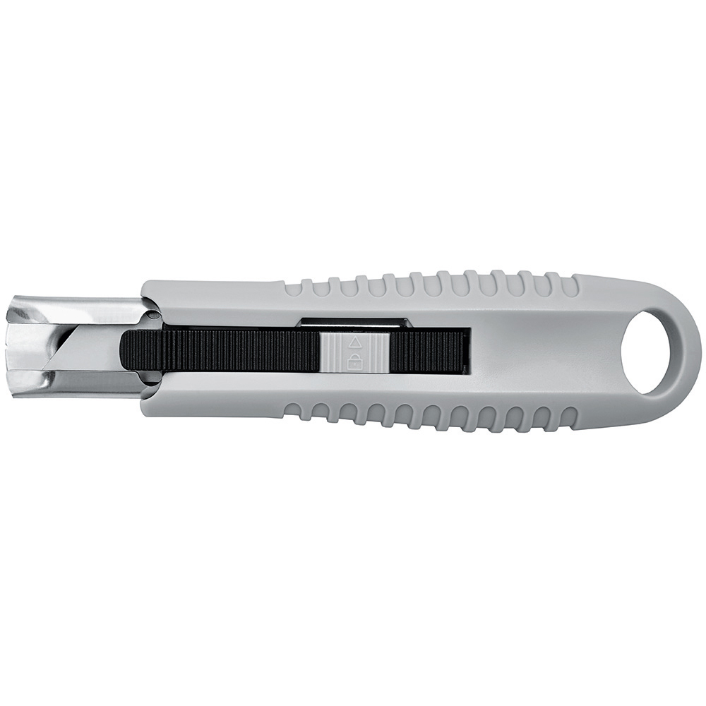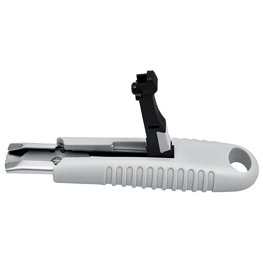 Sicherheitsmesser mit automatischem Klingenrückzug und Verriegelungsschutz. Die Klinge ist federbelastet und wird automatisch in das Gehäuse zurückgezogen, sobald der Anwender den Daumen vom Klingenschieber nimmt. Um ein unbeabsichtigtes Ausfahren der Klinge zu vermeiden, kann diese mit dem mechanischen Verriegelungsschutz gesichert werden. Gehäuse: schlagfestes Gehäuse aus ABS. Klinge: Trapezklinge aus SK2 Carbonstahl, Rockwell 62 HRC (gehobene Premium-Qualitätsstufe), max. Schnitttiefe 15 mm, 2-fach nutzbar durch 2-seitigen Schliff. Funktionen: Klingenwechsel ohne Hilfsmittel, Öse zum Anbringen eines Lanyards oder Fangriemen. Verpackung: schwarze Geschenkverpackung.