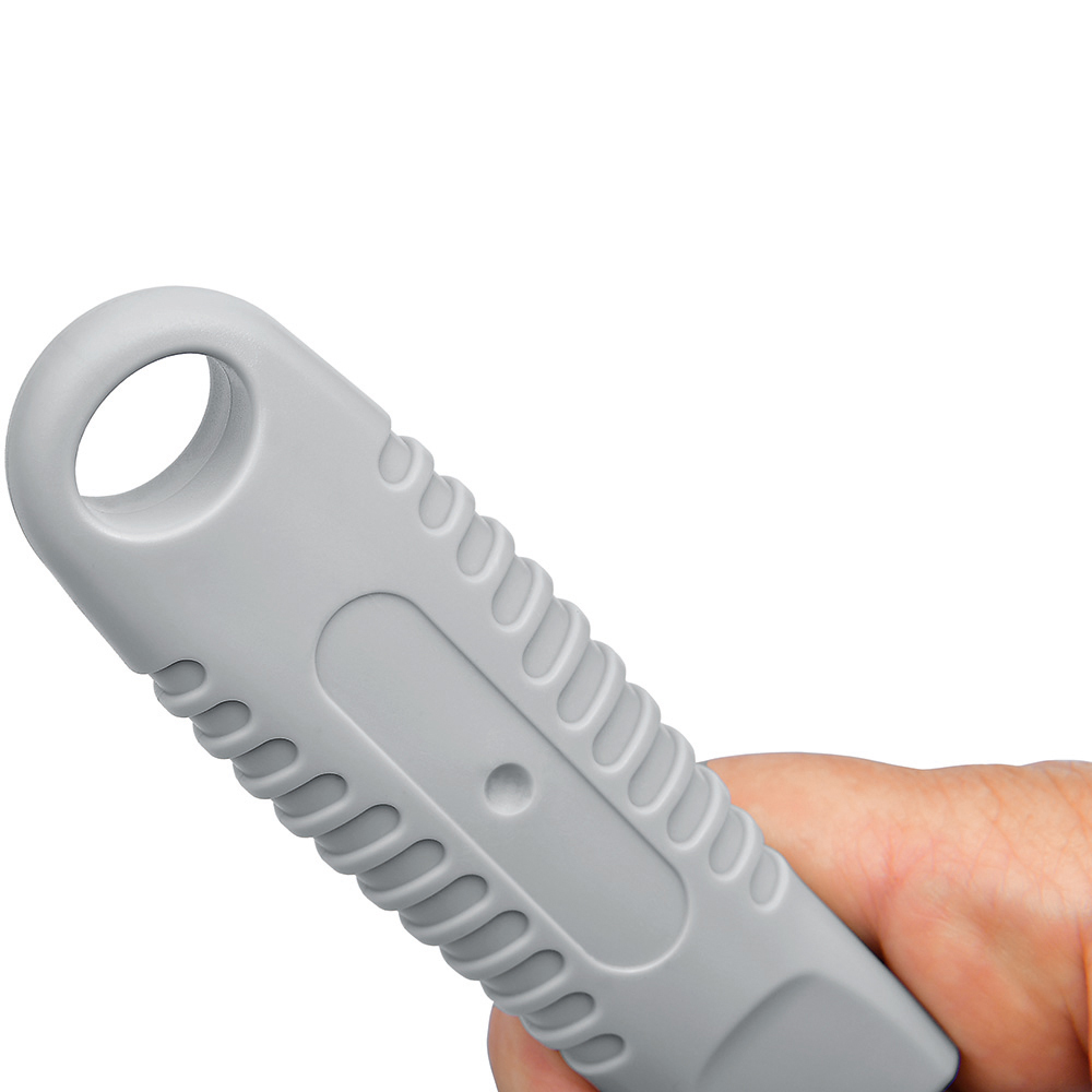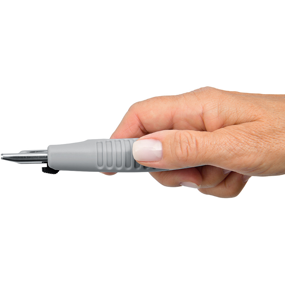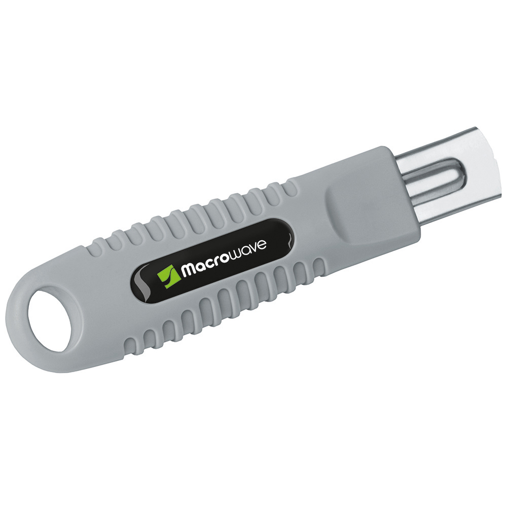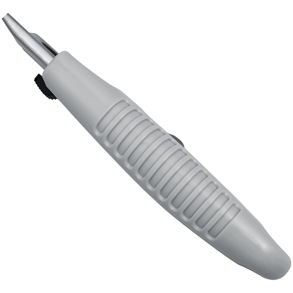 Sicherheitsmesser mit automatischem Klingenrückzug und Verriegelungsschutz. Die Klinge ist federbelastet und wird automatisch in das Gehäuse zurückgezogen, sobald der Anwender den Daumen vom Klingenschieber nimmt. Um ein unbeabsichtigtes Ausfahren der Klinge zu vermeiden, kann diese mit dem mechanischen Verriegelungsschutz gesichert werden. Gehäuse: schlagfestes Gehäuse aus ABS. Klinge: Trapezklinge aus SK2 Carbonstahl, Rockwell 62 HRC (gehobene Premium-Qualitätsstufe), max. Schnitttiefe 15 mm, 2-fach nutzbar durch 2-seitigen Schliff. Funktionen: Klingenwechsel ohne Hilfsmittel, Öse zum Anbringen eines Lanyards oder Fangriemen. Verpackung: schwarze Geschenkverpackung.