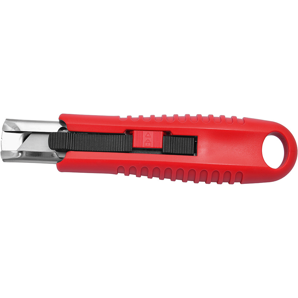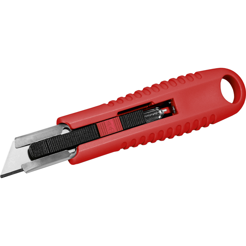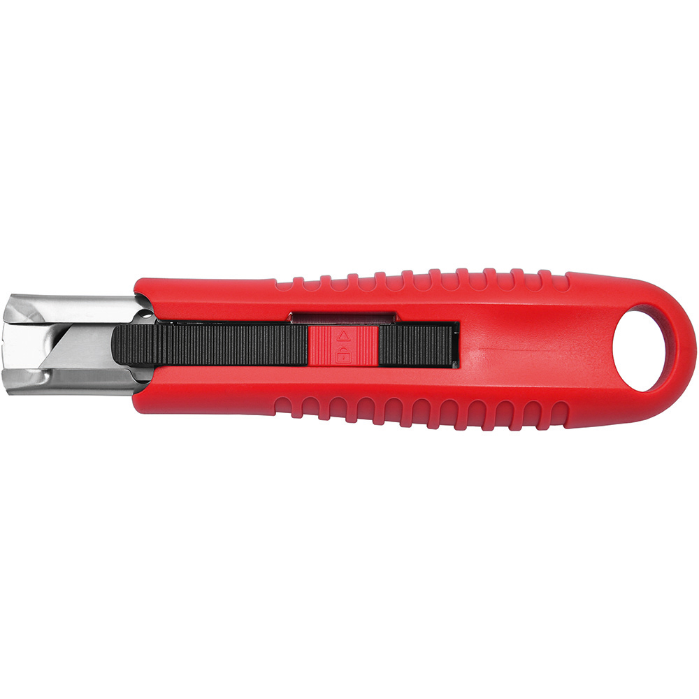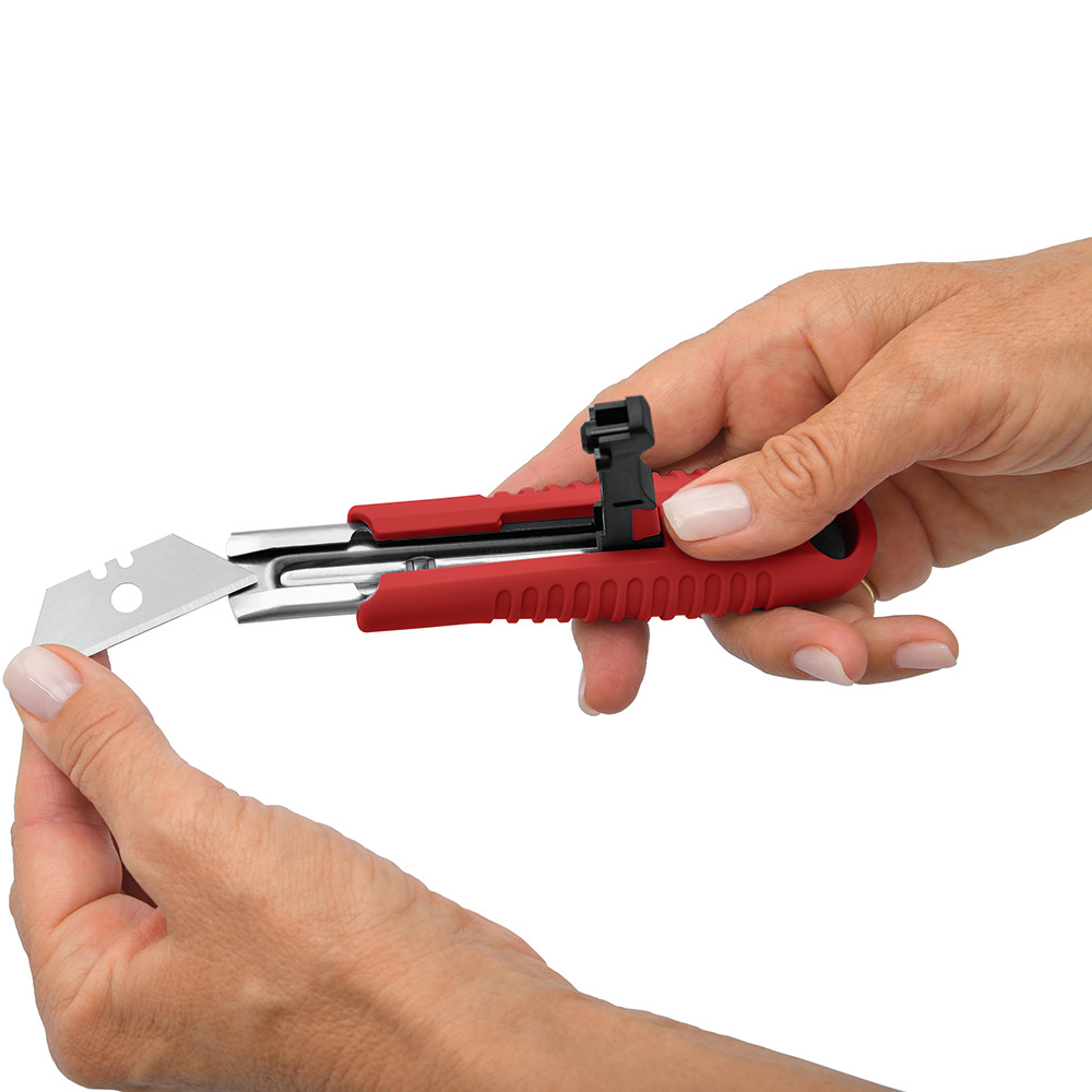 Sicherheitsmesser mit automatischem Klingenrückzug und Verriegelungsschutz. Die Klinge ist federbelastet und wird automatisch in das Gehäuse zurückgezogen, sobald der Anwender den Daumen vom Klingenschieber nimmt. Um ein unbeabsichtigtes Ausfahren der Klinge zu vermeiden, kann diese mit dem mechanischen Verriegelungsschutz gesichert werden. Gehäuse: schlagfestes Gehäuse aus ABS. Klinge: Trapezklinge aus SK2 Carbonstahl, Rockwell 62 HRC (gehobene Premium-Qualitätsstufe), max. Schnitttiefe 15 mm, 2-fach nutzbar durch 2-seitigen Schliff. Funktionen: Klingenwechsel ohne Hilfsmittel, Öse zum Anbringen eines Lanyards oder Fangriemen. Verpackung: schwarze Geschenkverpackung.