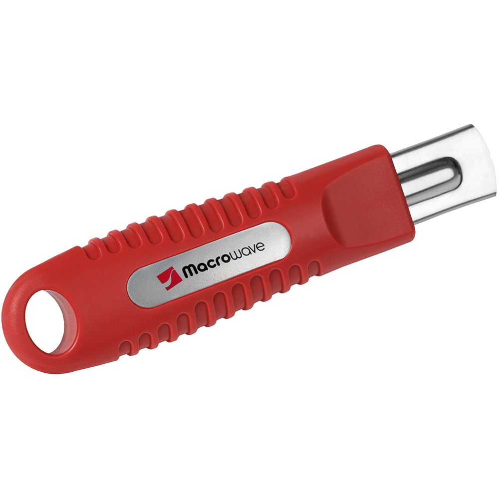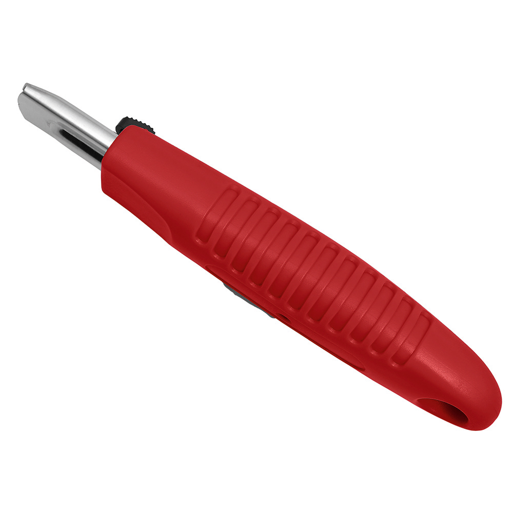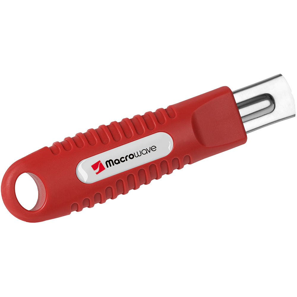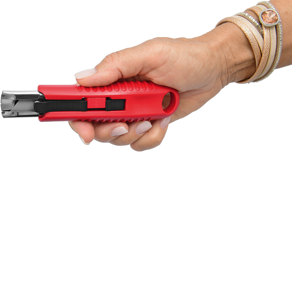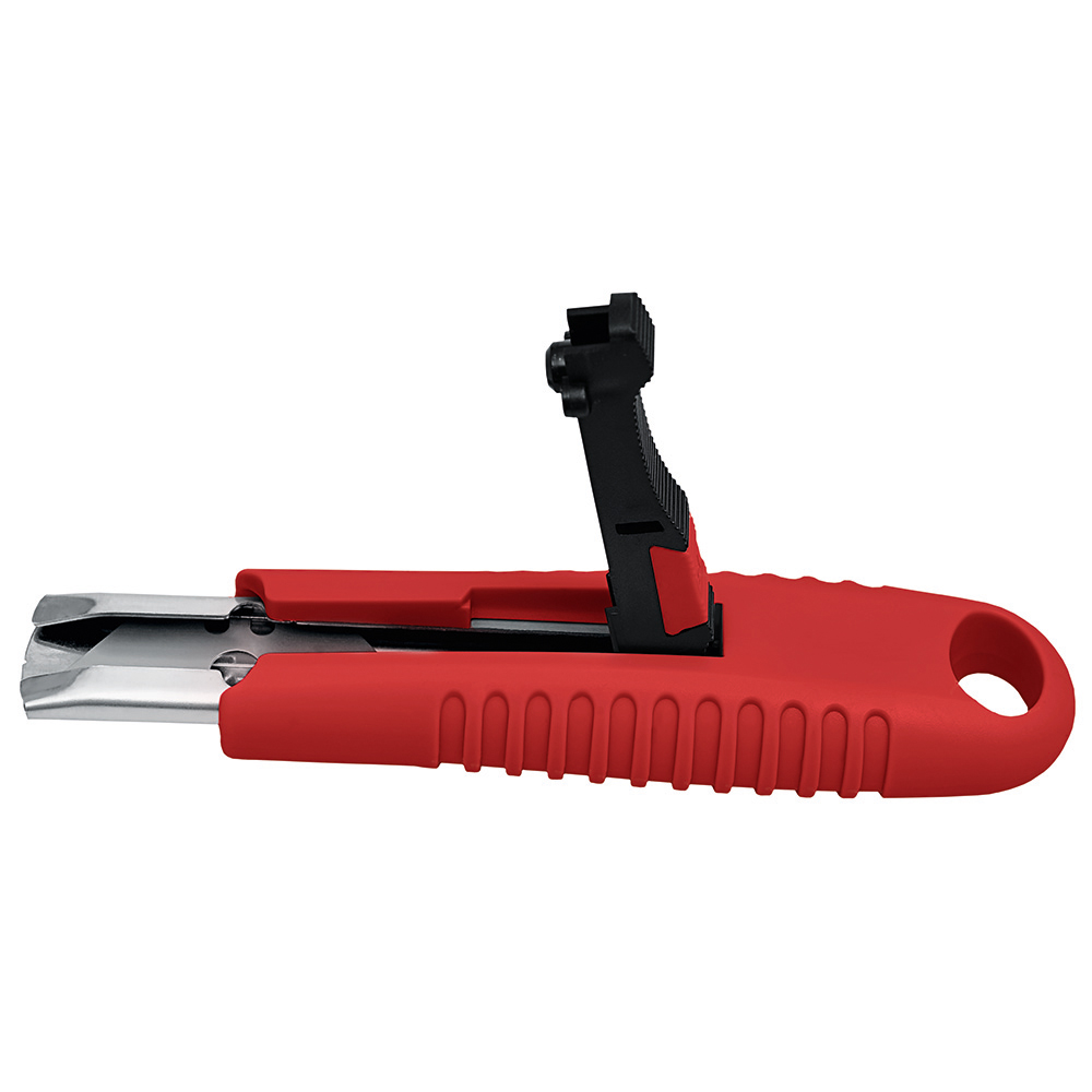 Sicherheitsmesser mit automatischem Klingenrückzug und Verriegelungsschutz. Die Klinge ist federbelastet und wird automatisch in das Gehäuse zurückgezogen, sobald der Anwender den Daumen vom Klingenschieber nimmt. Um ein unbeabsichtigtes Ausfahren der Klinge zu vermeiden, kann diese mit dem mechanischen Verriegelungsschutz gesichert werden. Gehäuse: schlagfestes Gehäuse aus ABS. Klinge: Trapezklinge aus SK2 Carbonstahl, Rockwell 62 HRC (gehobene Premium-Qualitätsstufe), max. Schnitttiefe 15 mm, 2-fach nutzbar durch 2-seitigen Schliff. Funktionen: Klingenwechsel ohne Hilfsmittel, Öse zum Anbringen eines Lanyards oder Fangriemen. Verpackung: schwarze Geschenkverpackung.