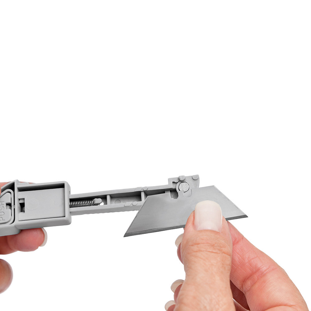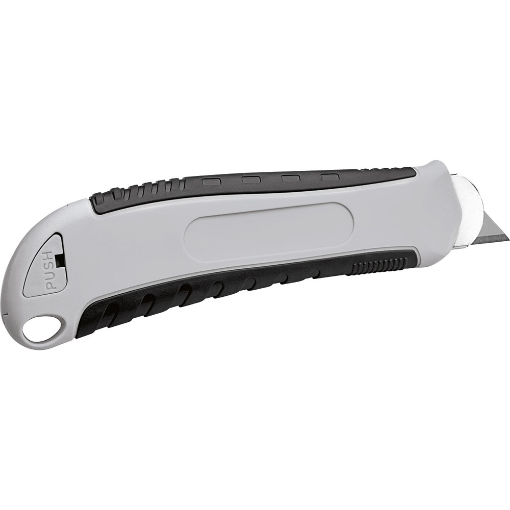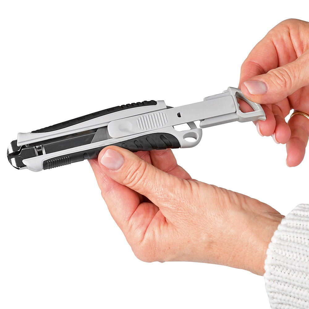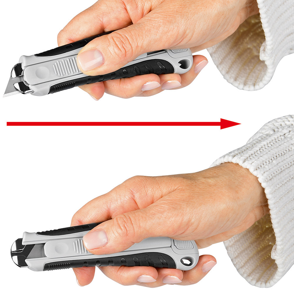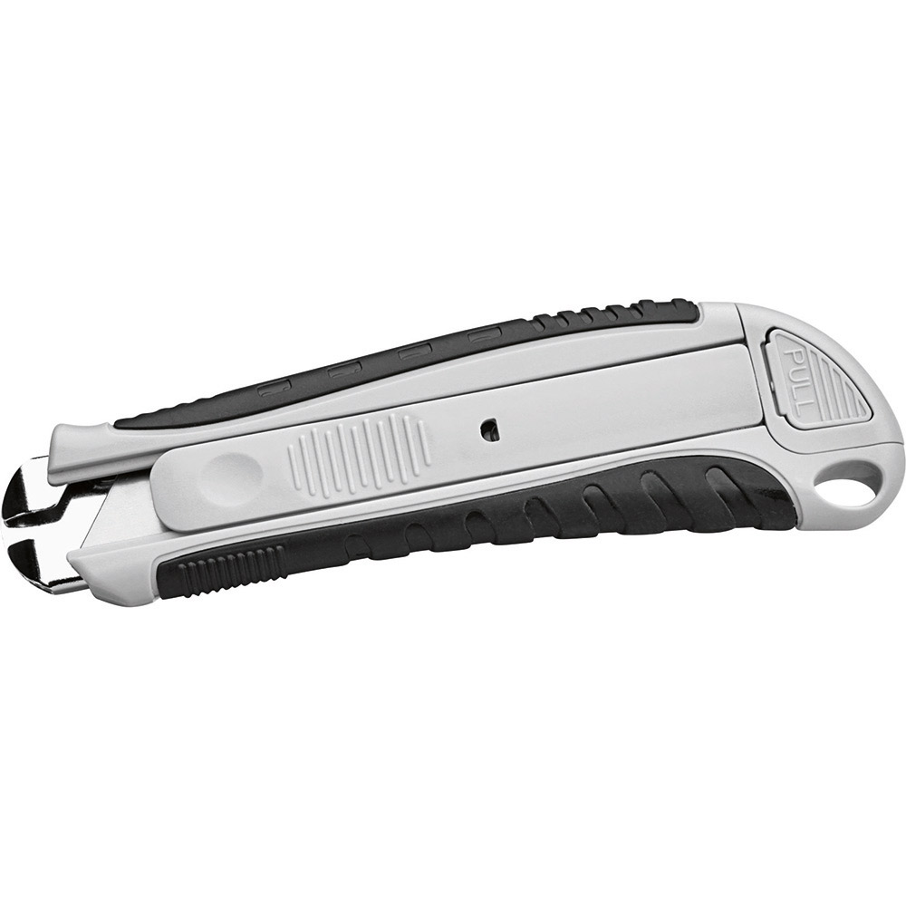 Sicherheitsmesser mit automatischem Klingenrückzug. Das Sicherheitsmesser erfüllt höchste Ansprüche im Bereich Arbeitsschutz und Arbeitssicherheit. Die Klinge ist federbelastet und wird automatisch in das Gehäuse zurückgezogen, sobald der Anwender den Daumen vom Klingenschieber nimmt. Eine Besonderheit ist auch der magnetische Klingenhalter, durch den der Klingenwechsel sicher, schnell und problemlos durchgeführt werden kann. Material: schlagfestes 2-Komponenten-Gehäuse aus ABS und TPR, Klingenführungsschiene aus Metall. Klinge: Trapezklinge aus SK4 Carbonstahl, Rockwell 62 HRC (gehobene Qualitätsstufe), max. Schnitttiefe 13 mm, 2-fach nutzbar durch 2-seitigen Schliff. Funktionen: Klingenwechsel ohne Hilfsmittel, magnetischer Klingenhalter, Öse zum Anbringen eines Lanyards oder Fangriemen. Verpackung: schwarze Geschenkverpackung.