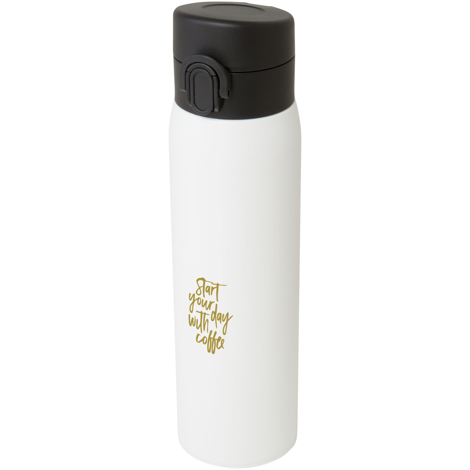 Elegante, RCS-zertifizierte Isolierflasche aus recyceltem Edelstahl mit einfachem Öffnungsmechanismus per Knopfdruck. Die Flasche ist auslaufsicher, und dank der Kupfer-Vakuumisolierung bleiben die Getränke mehrere Stunden lang heiß oder kalt. Das Fassungsvermögen beträgt 450 ml. Verpackt in einer Geschenkbox aus Recyclingkarton.