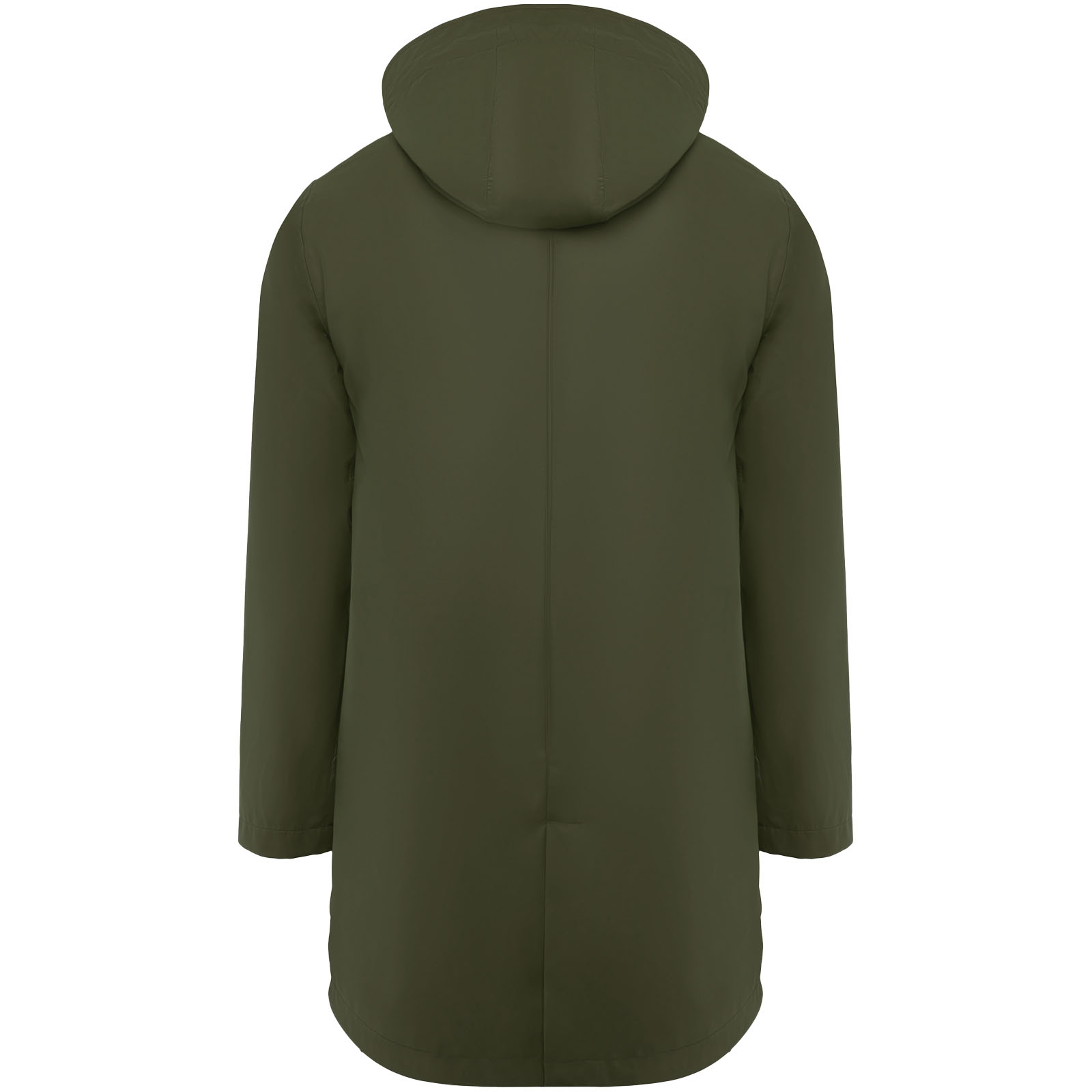 Wasserdichter Regenmantel. Kapuze mit Visier. Hitzeversiegelte Reißverschlüsse und Nähte. Kontrastierende Details in Schwarz. Zwei Seitentaschen mit Reißverschluss. Schlitz am hinteren Saum. Herausnehmbares Etikett. Wasserdicht. Das Modell ist 185 cm groß und trägt Größe M.