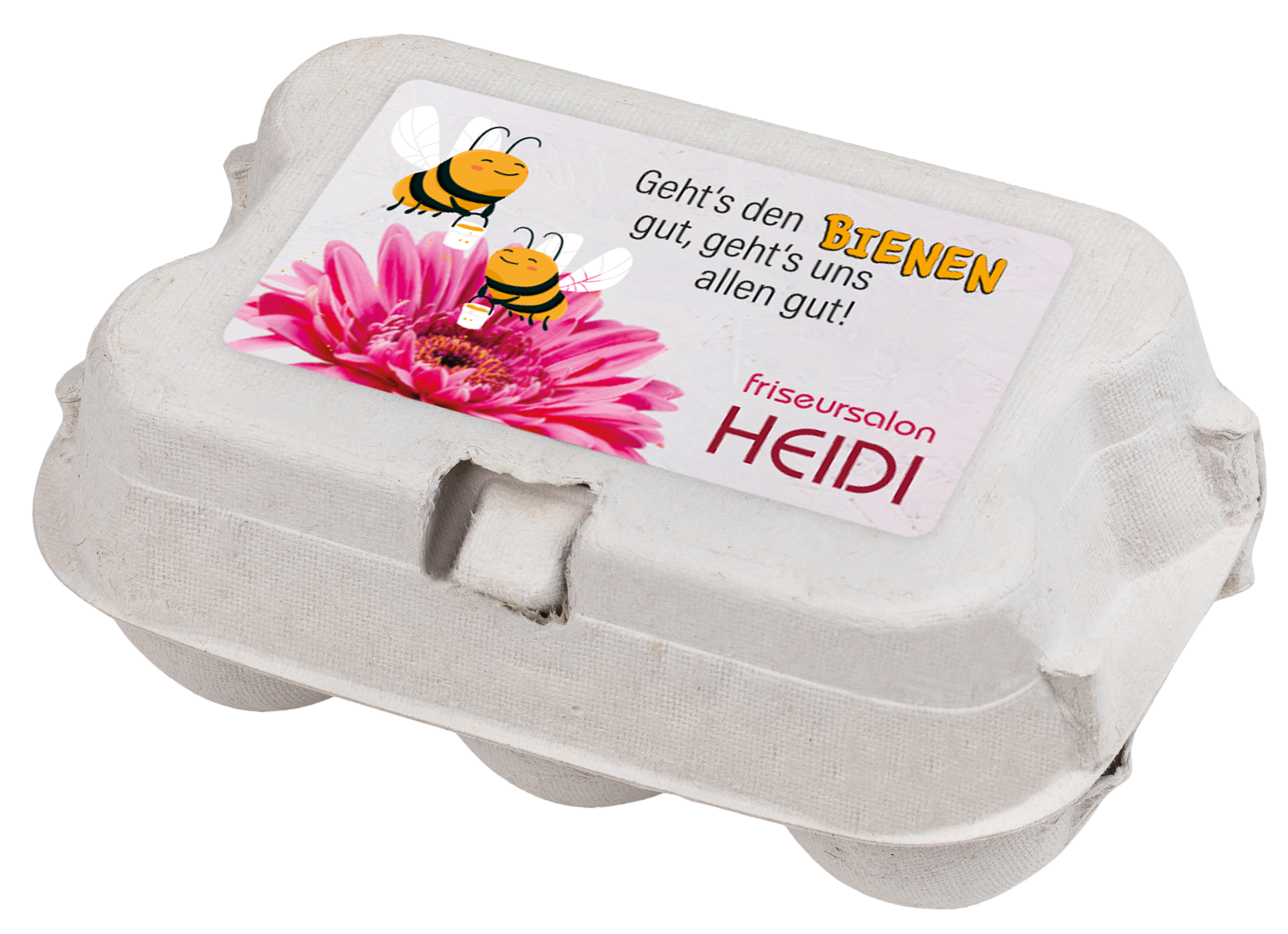 Gleich sechs Mal kann der Werbeartikelempfänger hier Gutes für die Natur tun, wenn er die Midi-Flower-Balls aus Erde, gespickt mit Sommerblumensamen auf den Boden wirft. Damit wird dafür gesorgt, dass eine kleine grüne Oase für Insekten und Bienen entsteht. Geliefert wird dieser außergewöhnliche Sixpack in einemnachhaltigen Eierkarton aus recyceltem Material – passend zu Ostern - in der Größe von Wachteleier-Schachteln. Durch einen farbenfrohen Aufkleber kann diese ideal mit einer österlichen Werbebotschaft versehen werden.