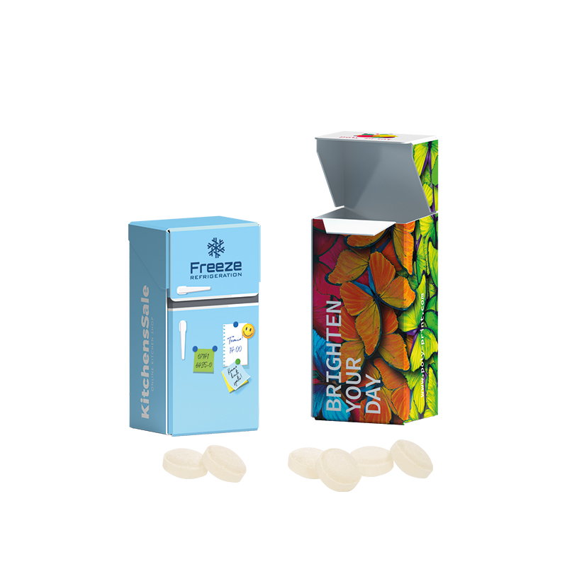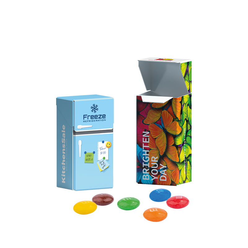 Box mit "Klick-Verschluss" aus weißem Karton in kompostierbarer Frischeversiegelung, individuell bedruckt. Inhalt: M&M's Chocolate, 12 g